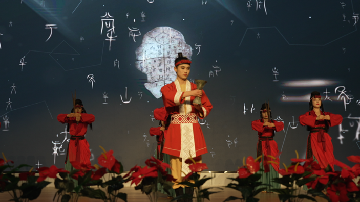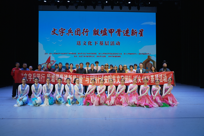 當晚,一場「穿越」千年、蘊含深情的殷商文化特色文藝演出在第十三師文化館精彩上演,來自古都安陽的文藝工作者為當地群眾帶來了一場內容豐富、形式多樣的文藝演出。舞蹈《甲骨文字秀》以甲骨文為舞蹈語彙創編的舞蹈作品,它形象地展現了古人造字的智慧;沉浸式表演《精忠報國》演繹着無數英雄豪傑的赤膽忠心;男聲三重唱《闊步前行》唱出了攜手並進、共創輝煌的決心和勇氣……這場獨具殷商特色的文藝演出深受當地群眾喜愛,成為了促進民族團結和睦和諧的文化盛宴。