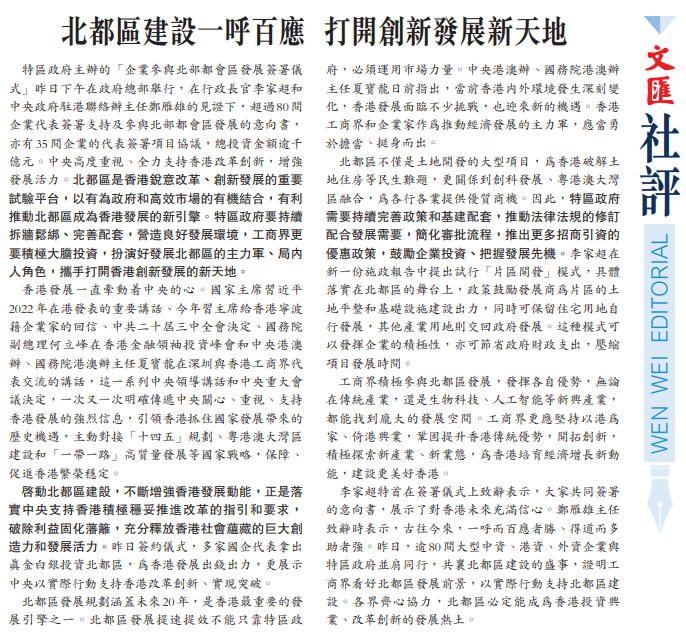 特區政府主辦的「企業參與北部都會區發展簽署儀式」昨日下午在政府總部舉行,在行政長官李家超和中央政府駐港聯絡辦主任鄭雁雄的見證下,超過80間企業代表簽署支持及參與北部都會區發展的意向書,亦有35間企業的代表簽署項目協議,總投資金額逾千億元。中央高度重視、全力支持香港改革創新,增強發展活力。北都區是香港銳意改革、創新發展的重要試驗平台,以有為政府和高效市場的有機結合,有利推動北都區成為香港發展的新引擎。特區政府要持續拆牆鬆綁、完善配套,營造良好發展環境,工商界更要積極大膽投資,扮演好發展北都區的主力軍、局內人角色,攜手打開香港創新發展的新天地。