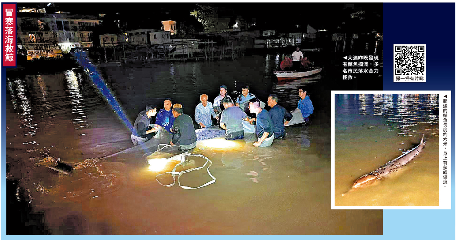 (大公報記者 吳俊宏 李清 蘇荣)一條約6米長受傷鯨魚在本港大澳水域擱淺,各方昨日連夜展開救援行動。聞訊而至的街坊及漁民自發走落水深及腰的海中嘗試為鯨魚解困,「睇下可唔可以拖返佢(鯨魚)出海」。當地村長告訴大公報記者,村民昨晚7時多已在現場幫助救援,「用不同的帆布袋兜住魚身,令鯨魚不會再摩擦到泥石。」