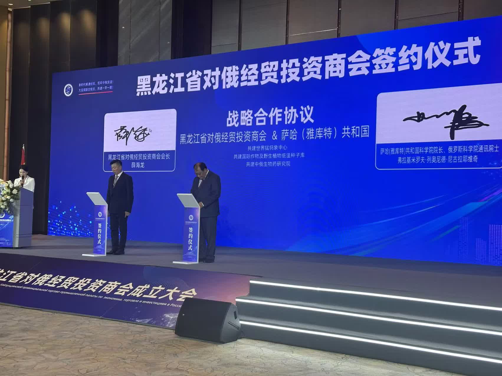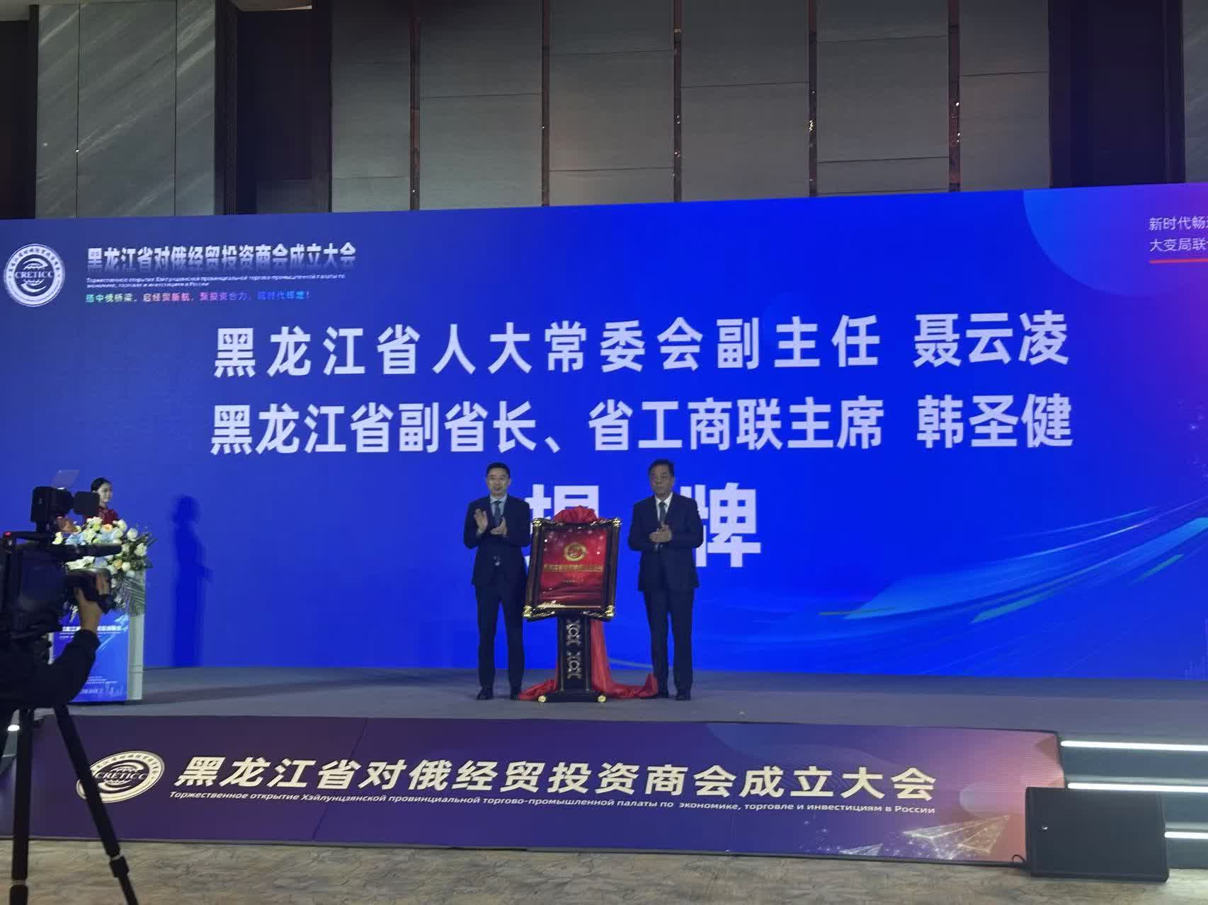 會上審議通過了商會章程,選舉產生了會長、副會長及第一屆理事會成員,黑龍江省人大常委會副主任聶雲凌與黑龍江省副省長、省工商聯主席韓聖健共同為黑龍江省對俄經貿投資商會揭牌。