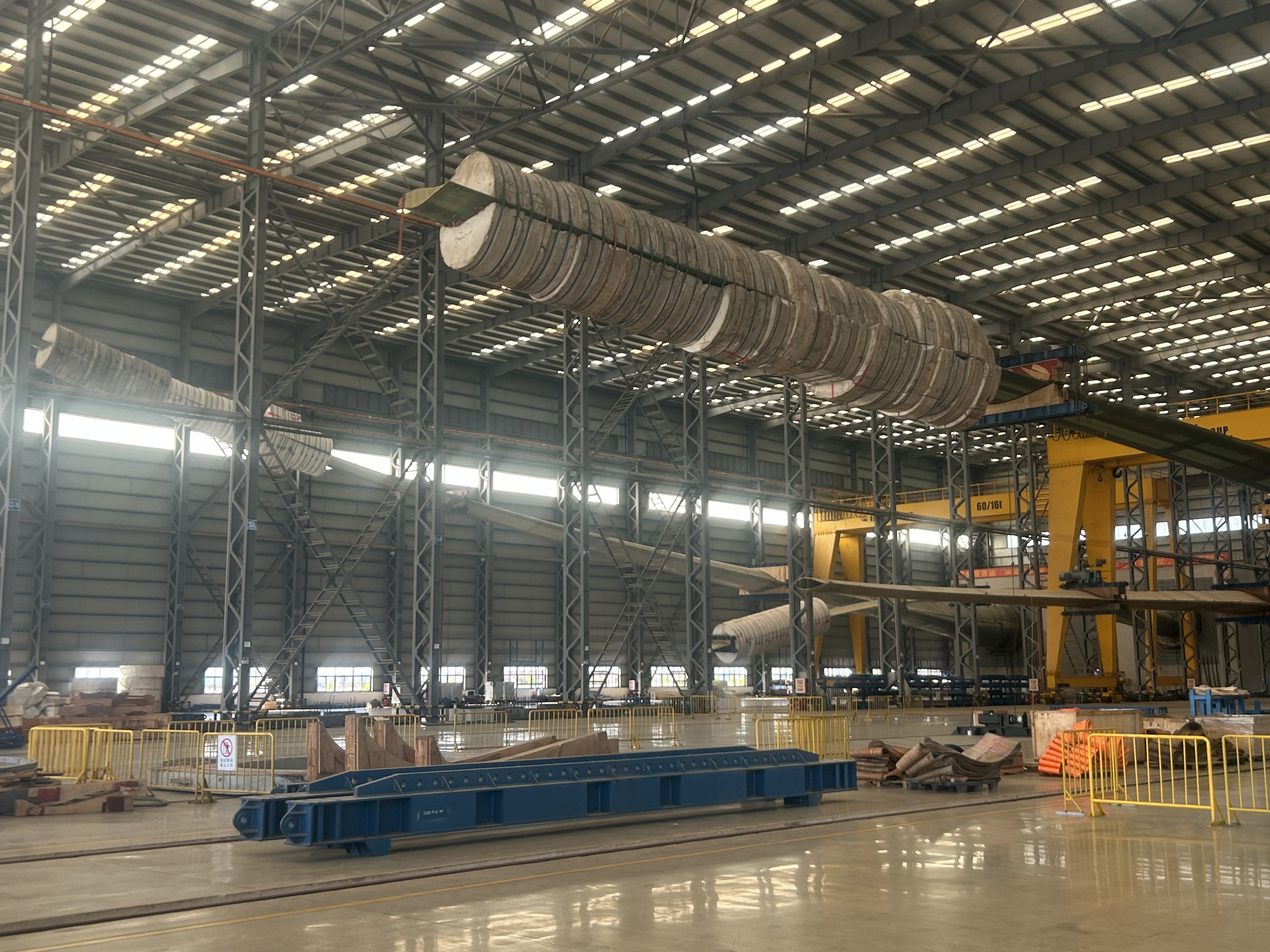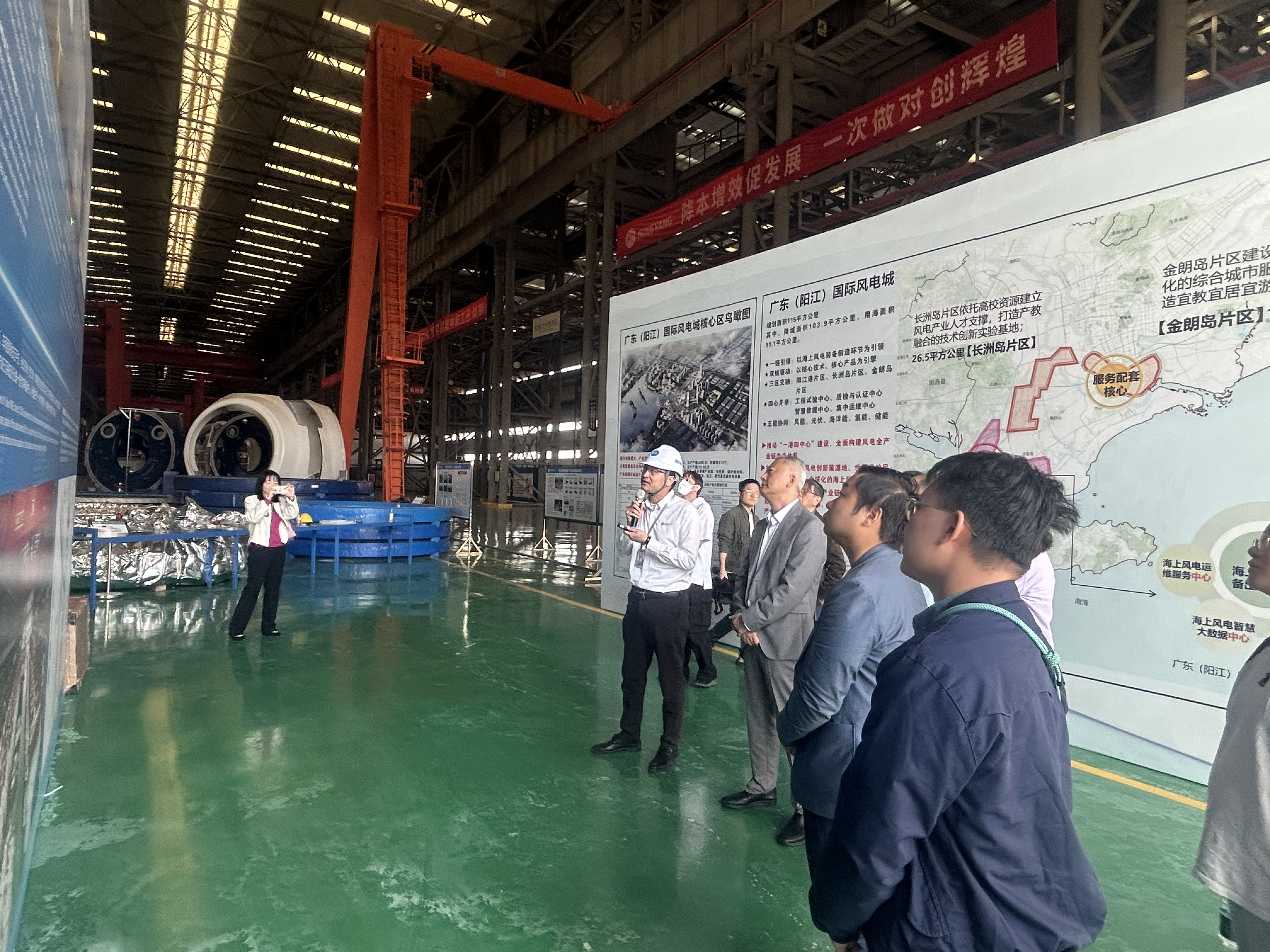除了設備檢測檢驗,整機裝備製造是陽江風電產業的重要環節。1日下午,考察團來到廣東明陽新能源科技有限公司,這裏是截至目前全國單體車間最大、起吊能力最大、產能規模最大的風電葉片和整機生產基地。