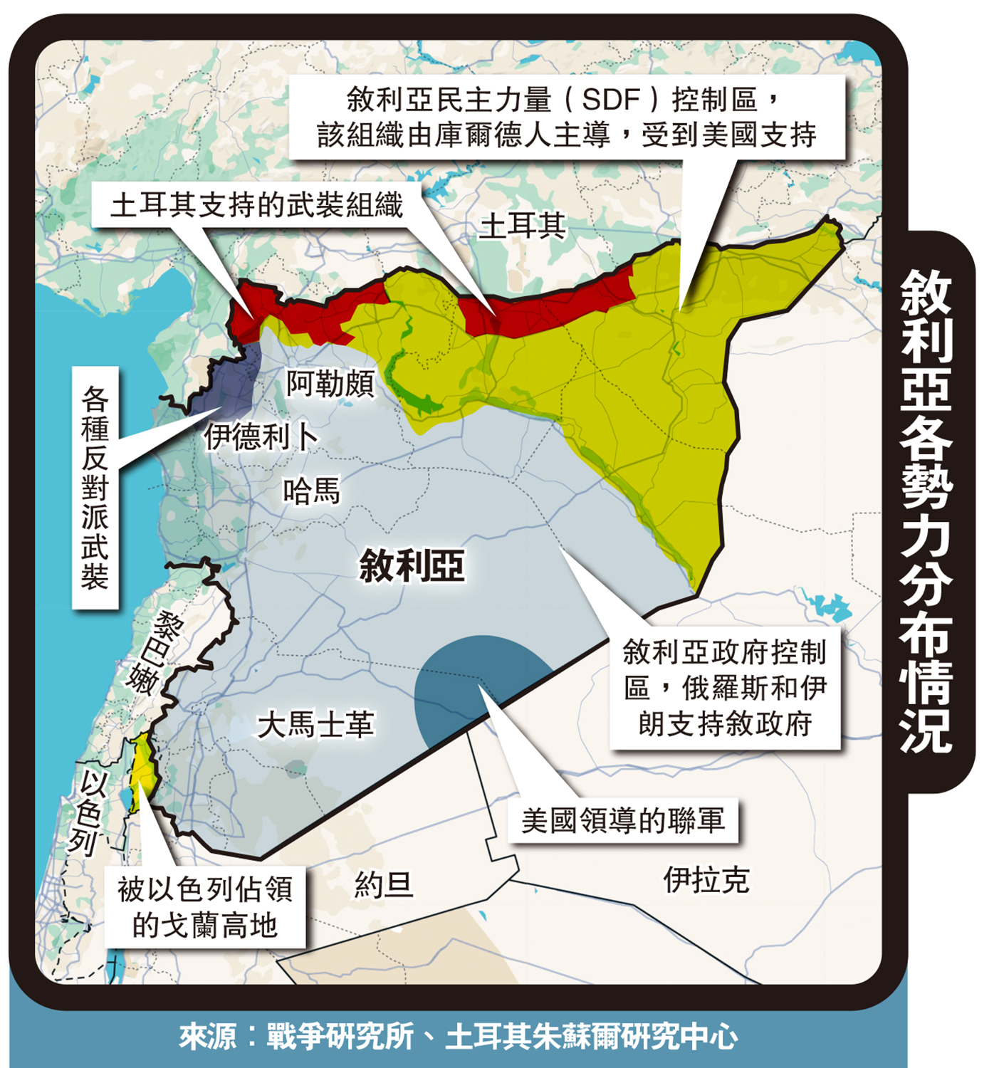 敘利亞是伊朗主導的抗以聯盟「抵抗之弧」的一員,也是俄羅斯在中東最重要的貿易夥伴之一,巴沙爾政府的存亡關係到莫斯科能否維持在中東的影響力。土耳其以打擊盤踞在土敘邊境地區的庫爾德武裝為藉口向敘利亞派兵,美國則支持庫爾德人主導的敘利亞民主力量(SDF)。多方角力之下,敘利亞持續動盪。