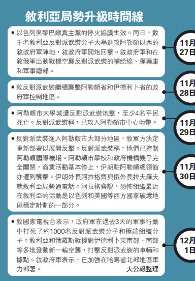 敘利亞總統巴沙爾11月30日表示,敘利亞有能力在盟友和友好國家的幫助下擊敗極端分子。敘國家電視台12月1日報道說,敘政府軍過去3天已打死約1000名反對派武裝分子和極端組織分子。敘政府軍和在敘俄軍1日出動戰機,對反對派武裝控制的伊德利卜地區發動新一輪空襲。