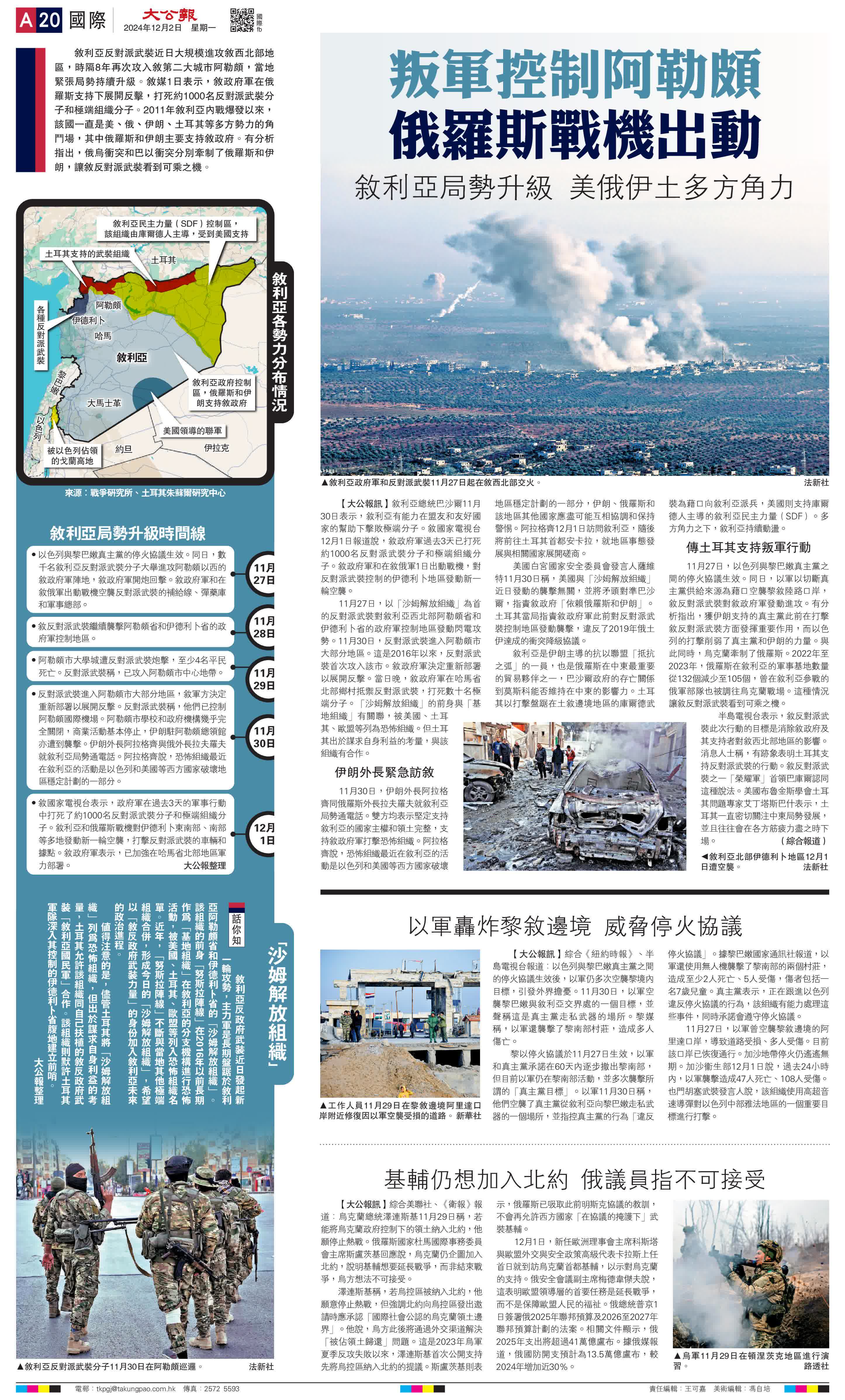 大公報綜合報道,敘利亞反對派武裝近日大規模進攻敘西北部地區,時隔8年再次攻入敘第二大城市阿勒頗,當地緊張局勢持續升級。敘媒1日表示,敘政府軍在俄羅斯支持下展開反擊,打死約1000名反對派武裝分子和極端組織分子。2011年敘利亞內戰爆發以來,該國一直是美、俄、伊朗、土耳其等多方勢力的角鬥場,其中俄羅斯和伊朗主要支持敘政府。有分析指出,俄烏衝突和巴以衝突分別牽制了俄羅斯和伊朗,讓敘反對派武裝看到可乘之機。