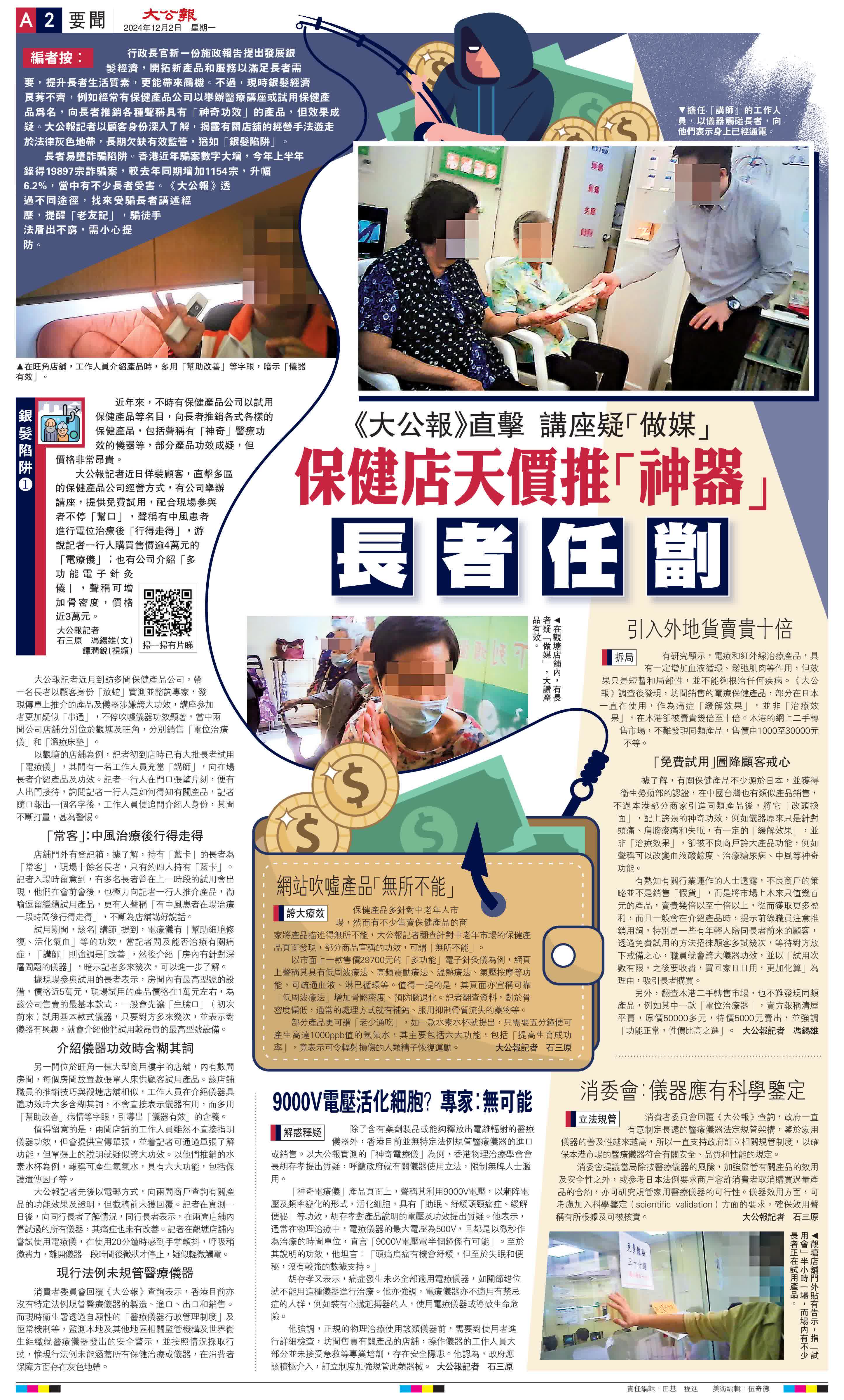 大公報記者近日佯裝顧客,直擊多區的保健產品公司經營方式,有公司舉辦講座,提供免費試用,配合現場參與者不停「幫口」,聲稱有中風患者進行電位治療後「行得走得」,游說記者一行人購買售價逾4萬元的「電療儀」;也有公司介紹「多功能電子針灸儀」,聲稱可增加骨密度,價格近3萬元。