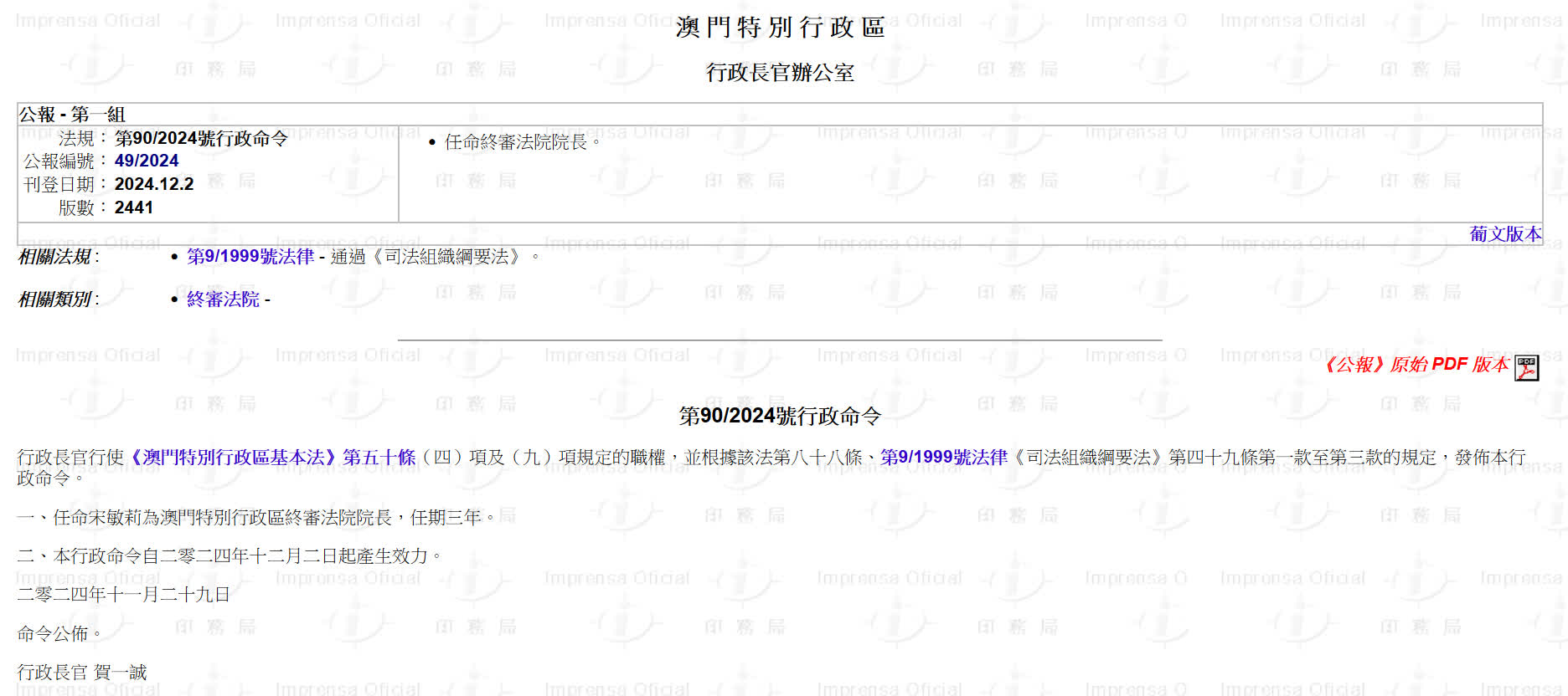 大公文匯網報道,澳門特別行政區政府公報12月2日刊登行政長官行政命令,任命宋敏莉為澳門特別行政區終審法院院長,任期三年。自2024年12月2日起產生效力。