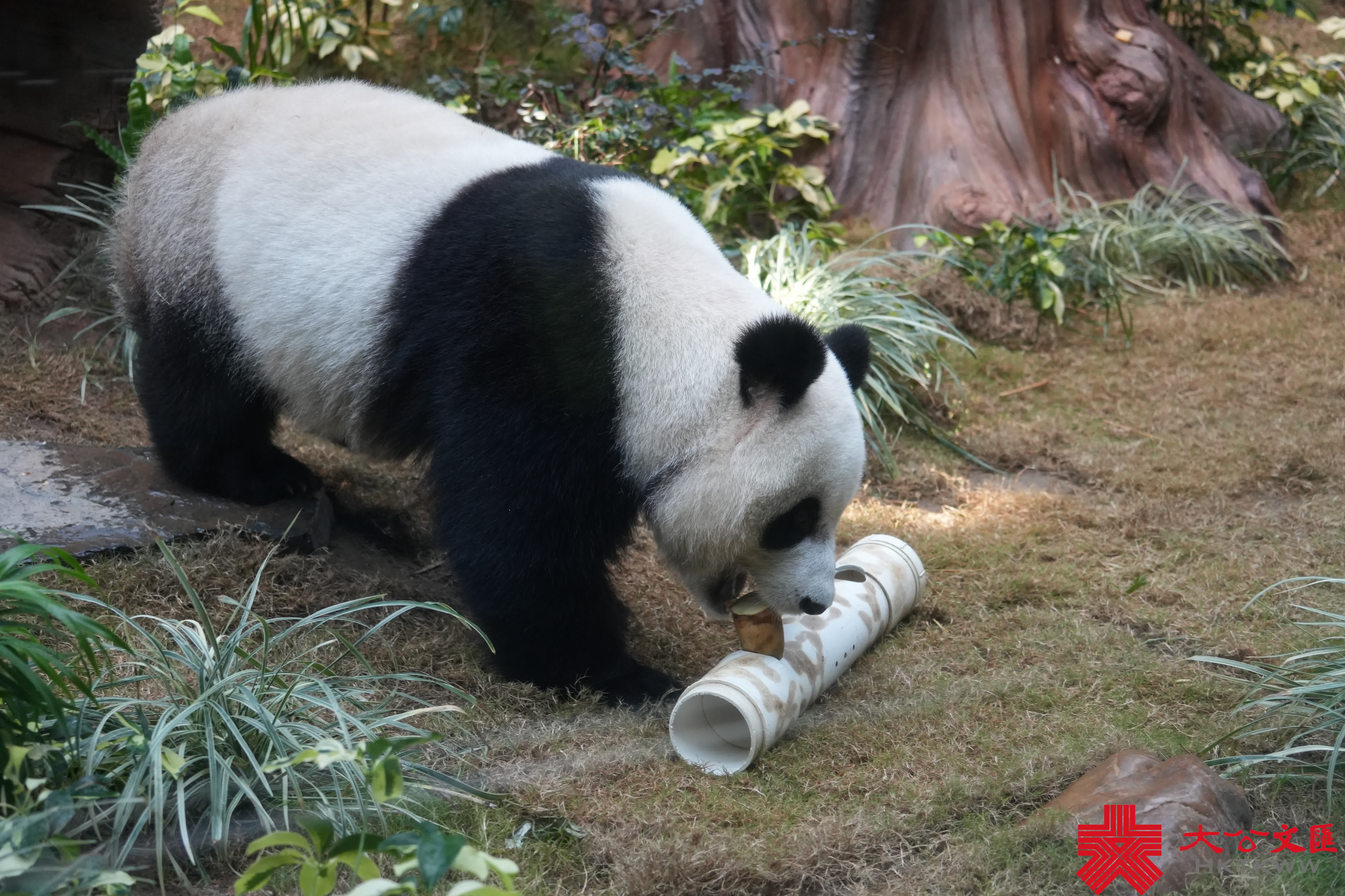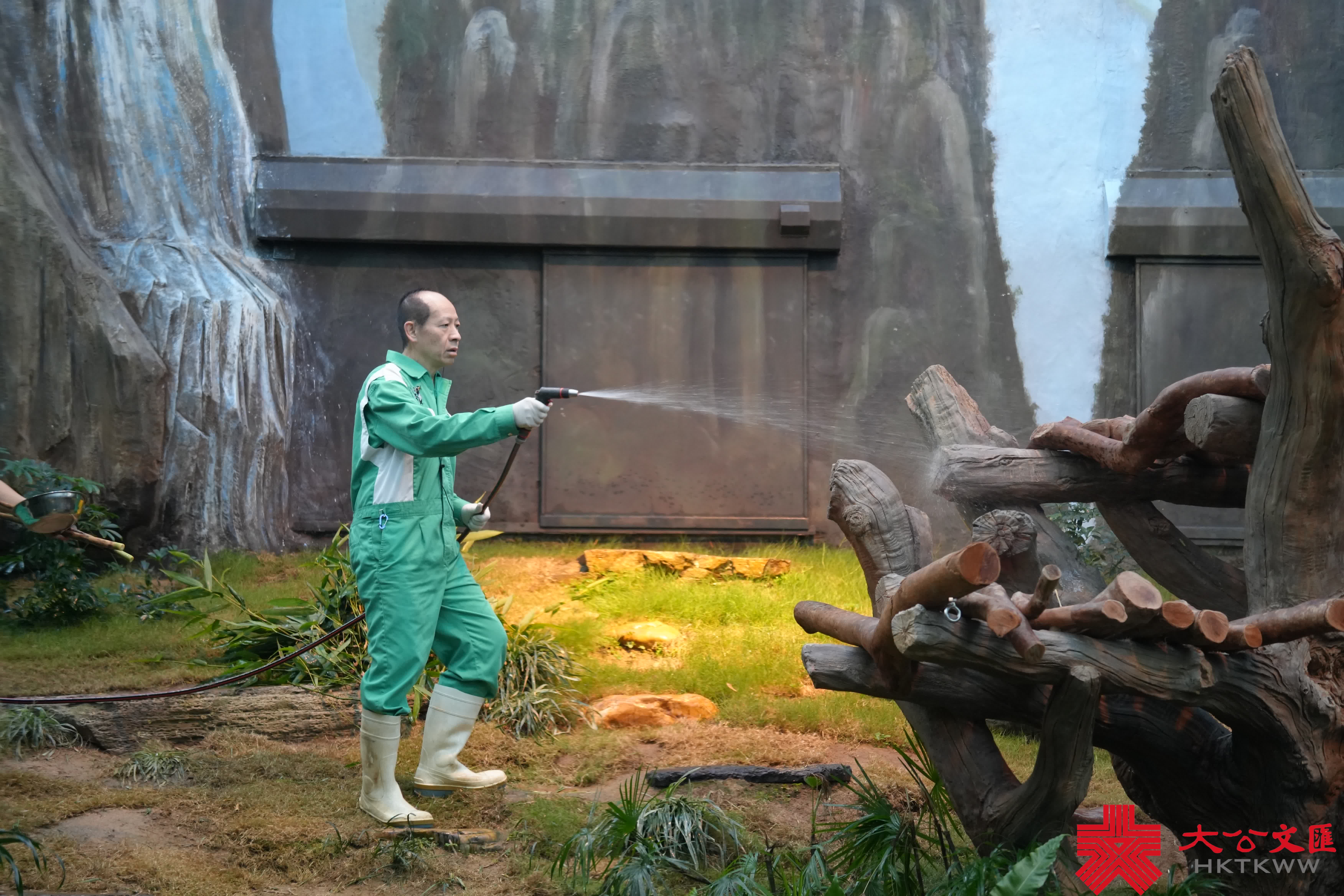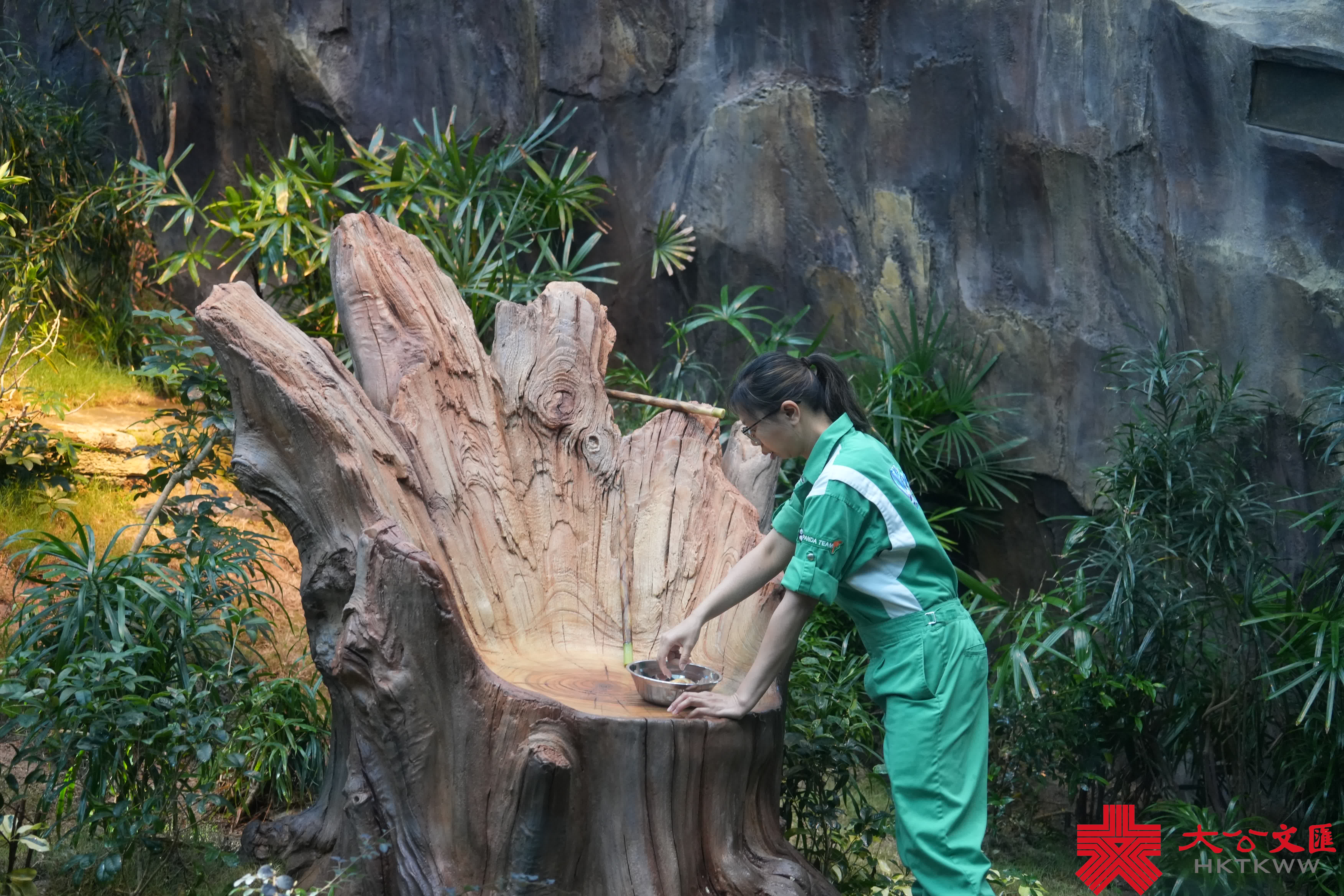 記者還觀察到,海洋公園精心布置了「安安」「可可」的居所。在安安的居所,有一個巨大的紅色玩具球和膠筒供牠玩耍,並有綠化植物、樹枝攀爬架等;在可可的居所,除了標誌性的「寶座」、綠化植物和攀爬架,還有供牠躲避的中空伏木。據工作人員介紹,場館的溫度會維持在19度。