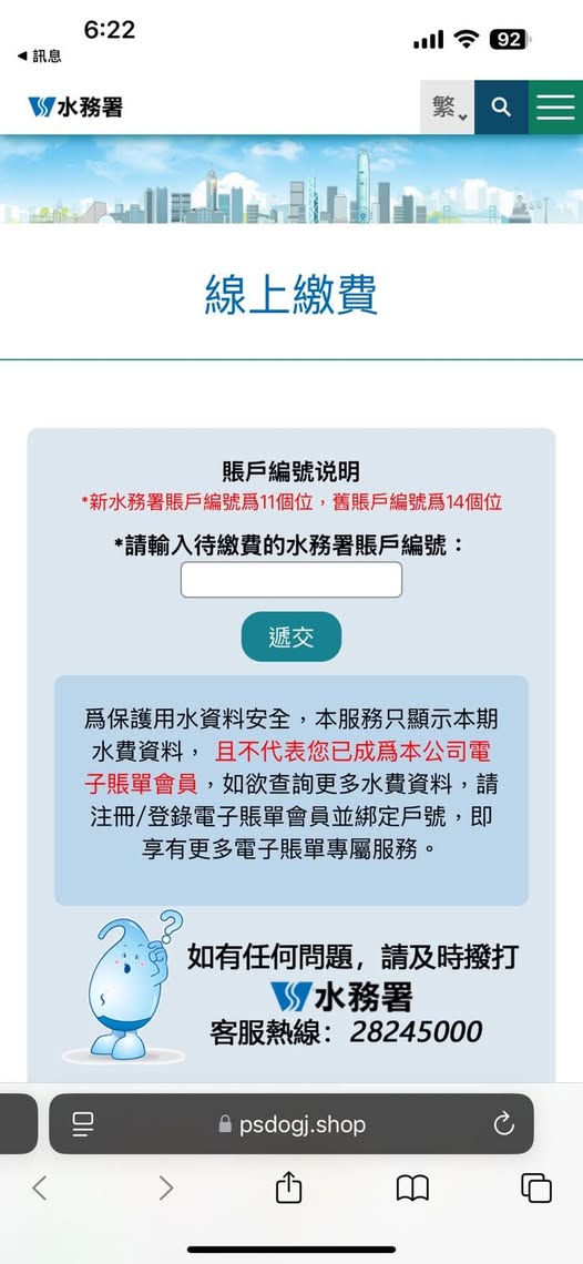 大公文匯全媒體報道,水務署早前提醒市民,提防一則偽裝署方發出的虛假欠費短訊及繳費網址,惟近日騙徒猖獗,此類短訊層出不窮。水務署表示,已就此事向警方報案。