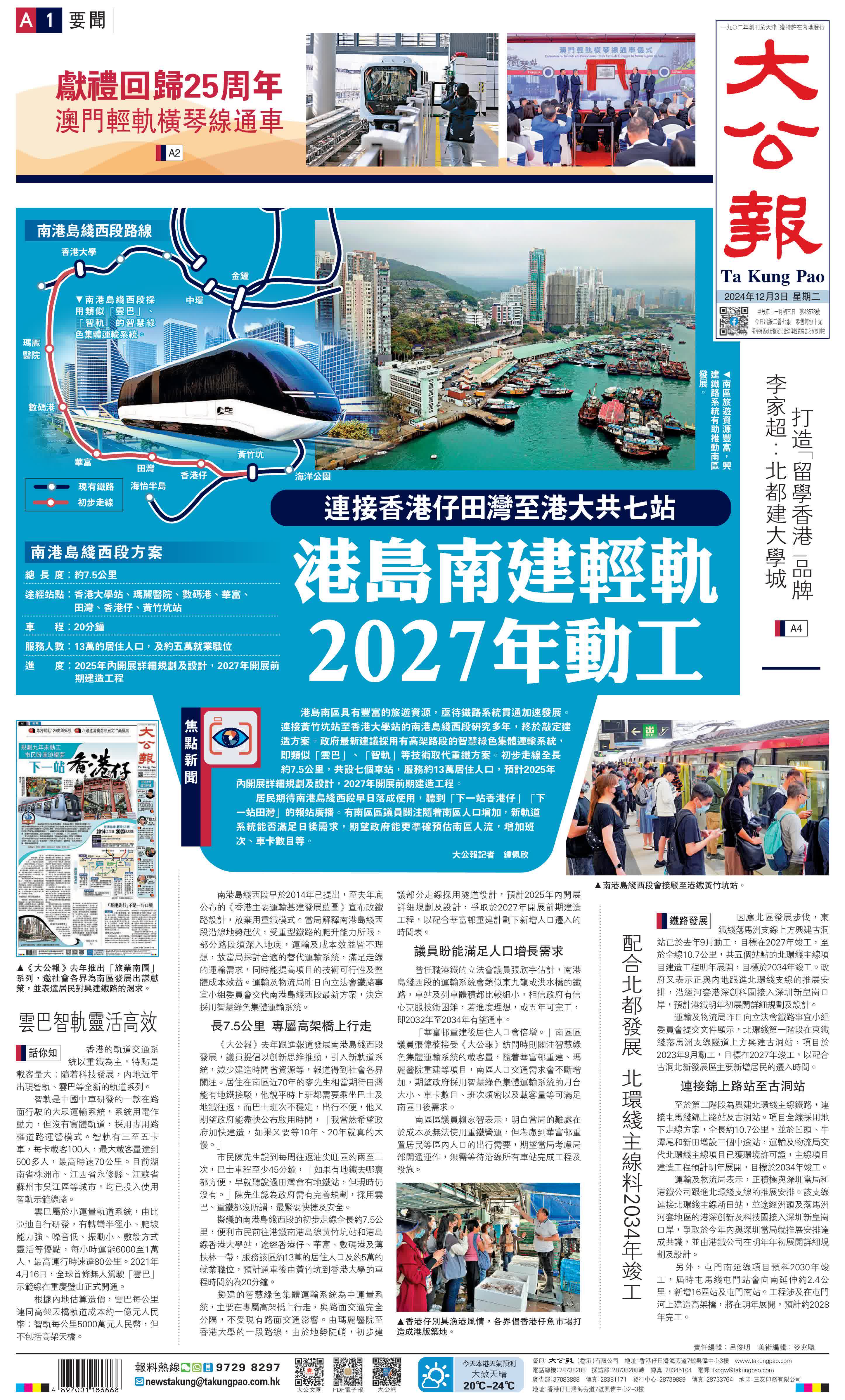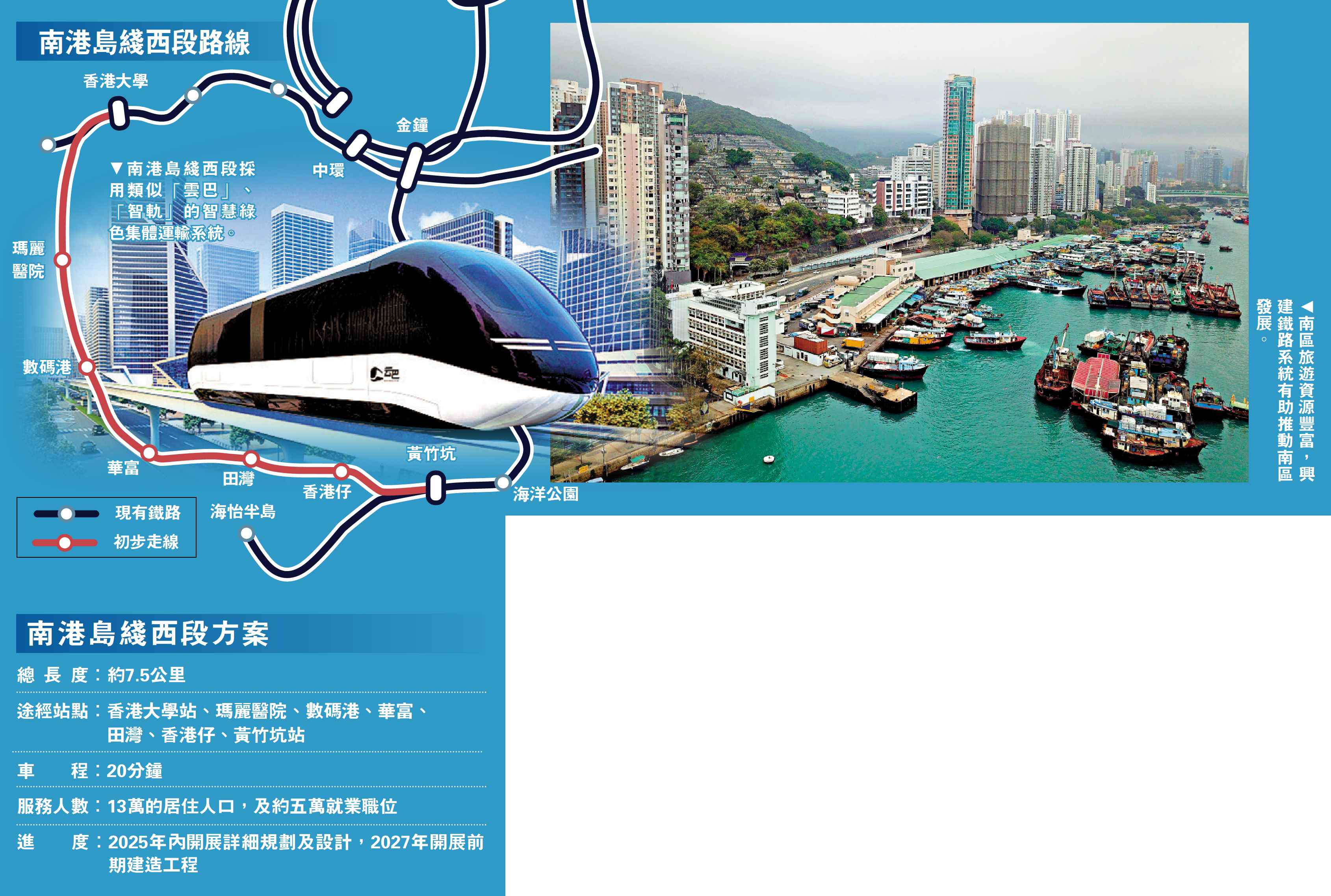(大公報記者 鍾佩欣)港島南區具有豐富的旅遊資源,亟待鐵路系統貫通加速發展。連接黃竹坑站至香港大學站的南港島綫西段研究多年,終於敲定建造方案。政府最新建議採用有高架路段的智慧綠色集體運輸系統,即類似「雲巴」、「智軌」等技術取代重鐵方案。初步走線全長約7.5公里,共設七個車站,服務約13萬居住人口,預計2025年內開展詳細規劃及設計,2027年開展前期建造工程。