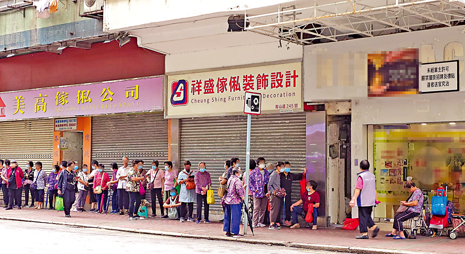 以深水埗的一間店舖為例,記者在上月上午八時許抵達,已見店外有逾40名長者排起十多米的人龍準備「聽講座」,部分長者更是提前一小時到場等候。店舖貼上不透光窗貼,令外人無法窺見內部情況。街坊表示,只有持集印卡片者方能入場,部分長者更是「常客」,有人已到場20日。