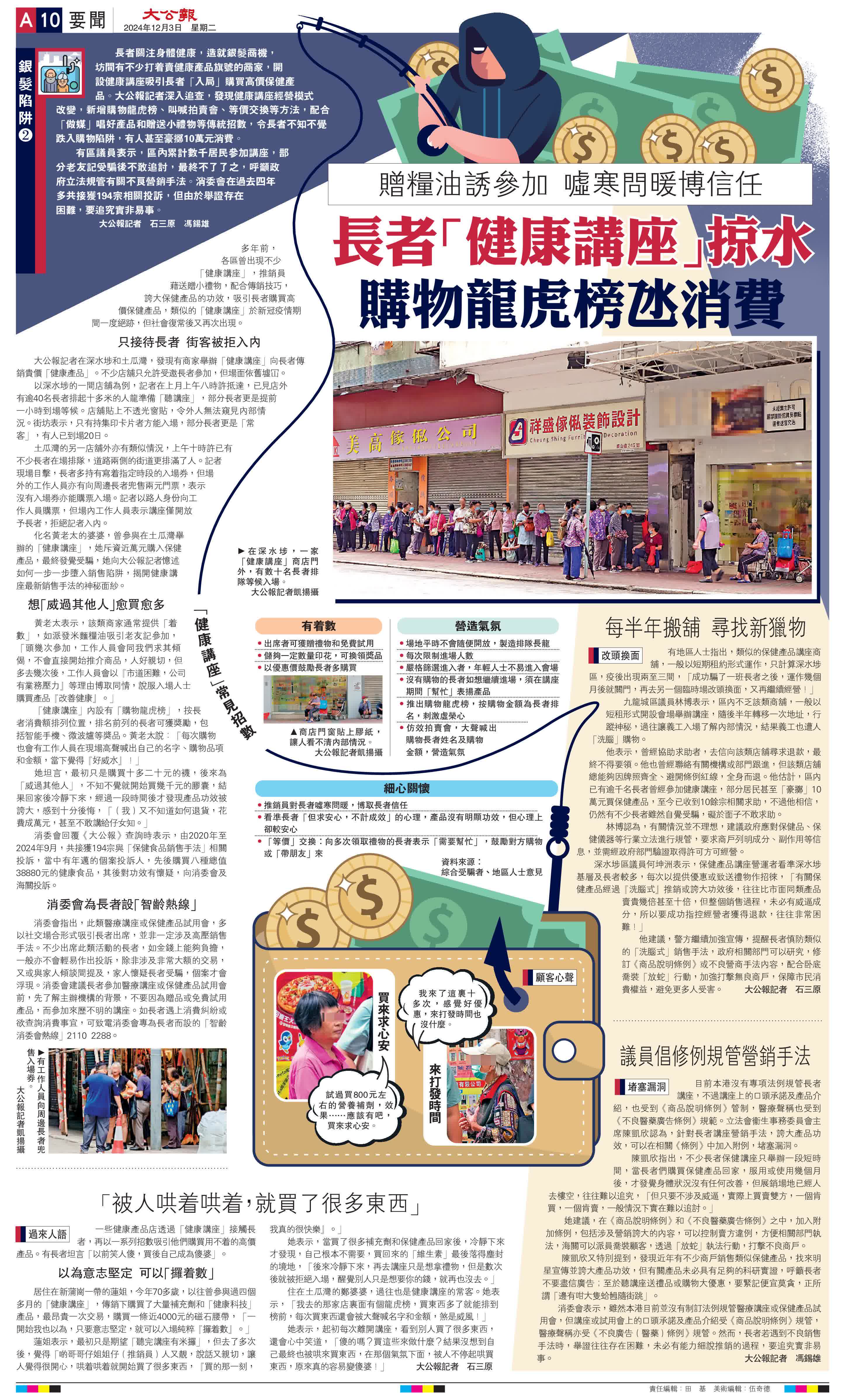 (大公報記者 石三原 馮錫雄)長者關注身體健康,造就銀髮商機,坊間有不少打着賣健康產品旗號的商家,開設健康講座吸引長者「入局」購買高價保健產品。大公報記者深入追查,發現健康講座經營模式改變,新增購物龍虎榜、叫喊拍賣會、等價交換等方法,配合「做媒」唱好產品和贈送小禮物等傳統招數,令長者不知不覺跌入購物陷阱,有人甚至豪擲10萬元消費。