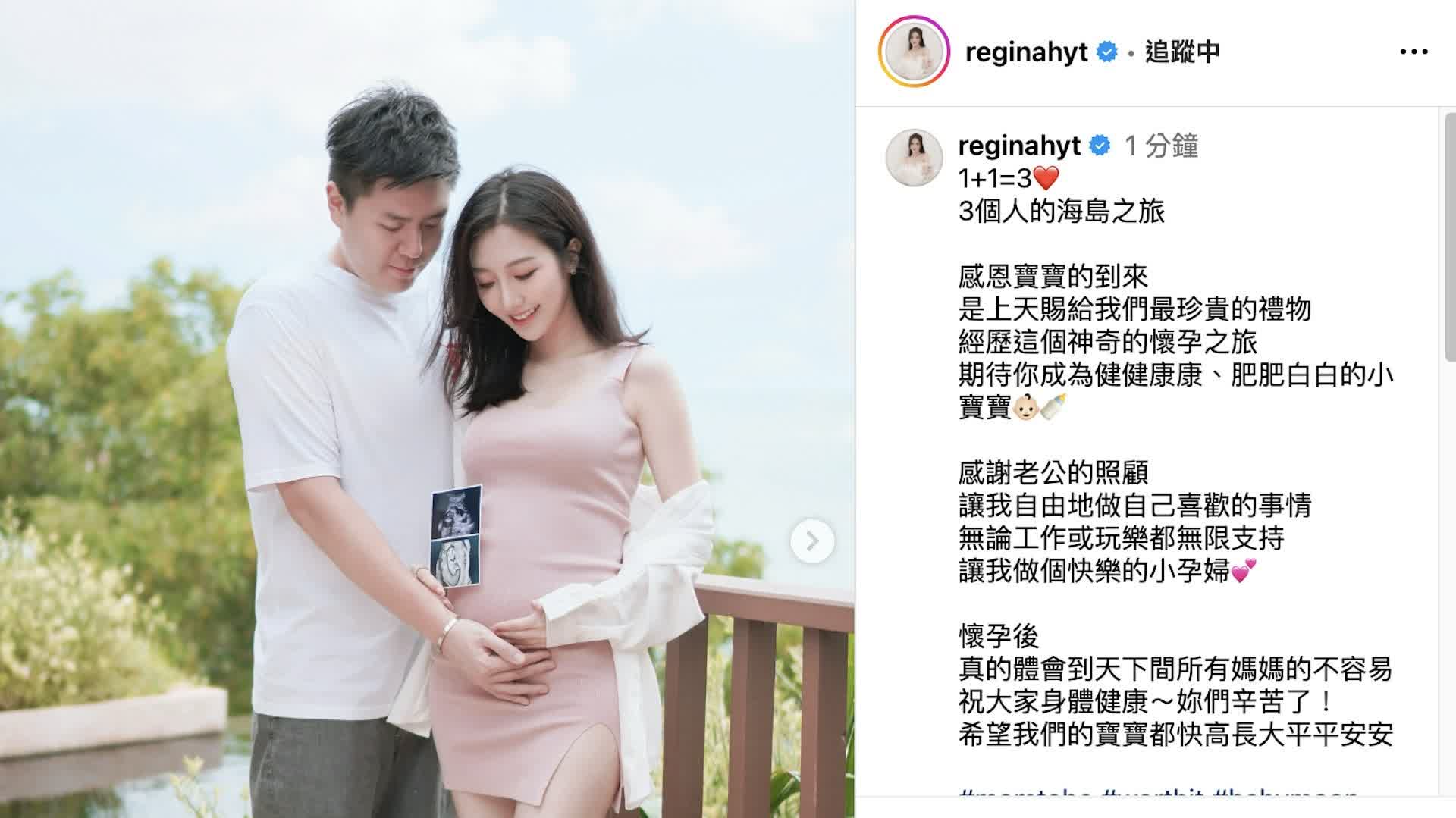 何依婷其後亦在IG發文正式公布喜訊:「1+1=3。3個人的海島之旅,感恩寶寶的到來,是上天賜給我們最珍貴的禮物,經歷這個神奇的懷孕之旅,期待你成為健健康康、肥肥白白的小寶寶。感謝老公的照顧,讓我自由地做自己喜歡的事情,無論工作或玩樂都無限支持,令我成為一個快樂的小孕婦。懷孕後,真的體會到天下間所有媽媽的不容易,祝大家身體健康~妳們辛苦了!」