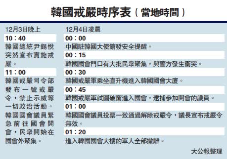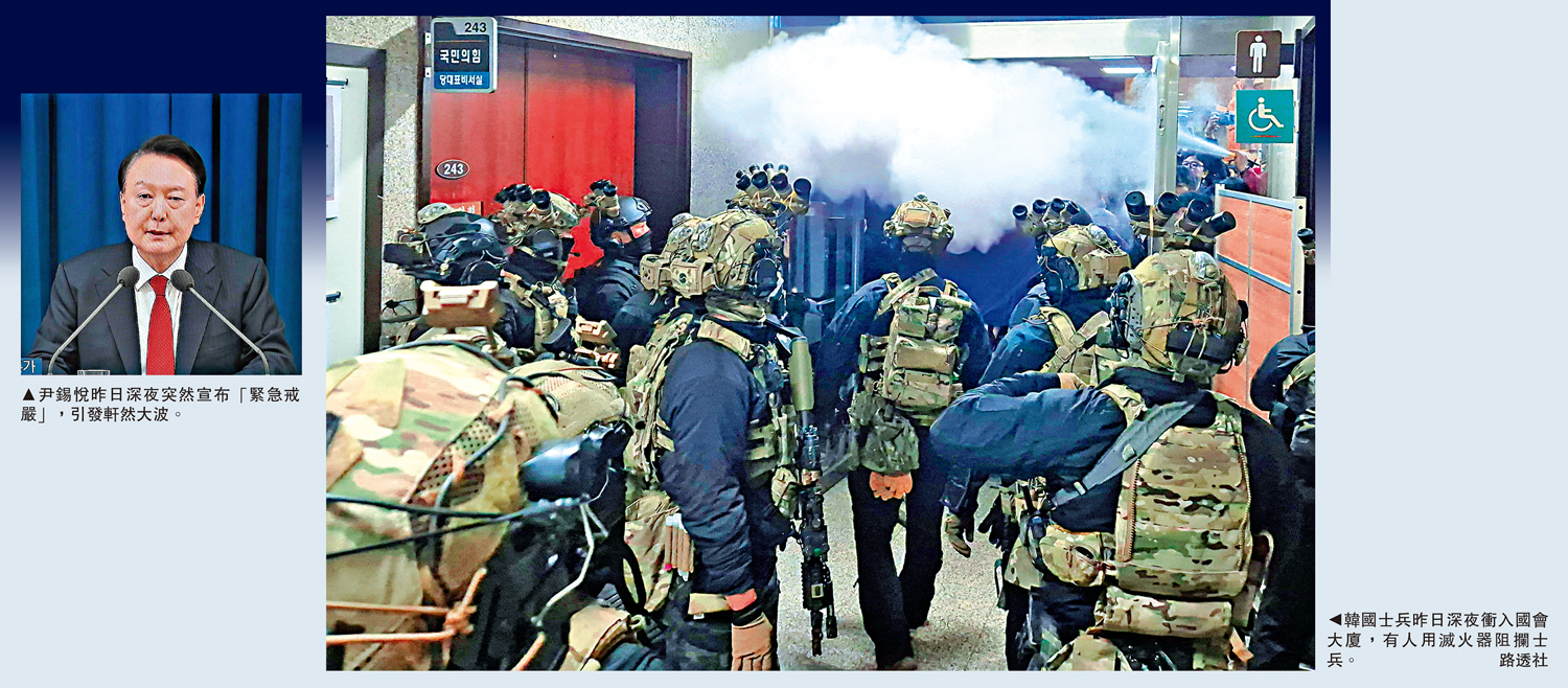 (大公報記者王可嘉 桂茹雲 戚佳潔)韓國政壇風雲突變,全球嘩然。當地時間3日晚,韓國總統尹錫悅突然宣布實施「緊急戒嚴」,並指責在野黨「裹挾國會,攪亂國家」。隨後,韓國國會出入口被封鎖,有士兵攜帶槍支從直升機上空降國會大廈。但兩個多小時後,韓國國會全票通過決議要求解除戒嚴。受消息影響,韓元兌美元一度跌2.7%。截至今日凌晨, 韓國政局前景未明。