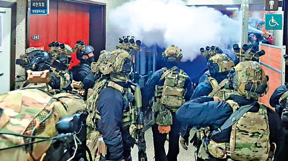 當地時間3日晚11點46分左右,3架直升機進入韓國國會大廈。有目擊者稱,有士兵從直升機上攜帶槍支空降國會。據報道,國會門前的公路上停着一輛韓國陸軍的中型巴士。韓國空降兵部隊一度試圖從後門進入國會大樓,國會議員及助手前去阻止。由於國會出入口被封鎖,李在明直播翻牆進入國會內部。有士兵試圖破窗進入國會,逮捕參加會議的議員。現場照片顯示,有人用滅火器阻攔進入國會的士兵。