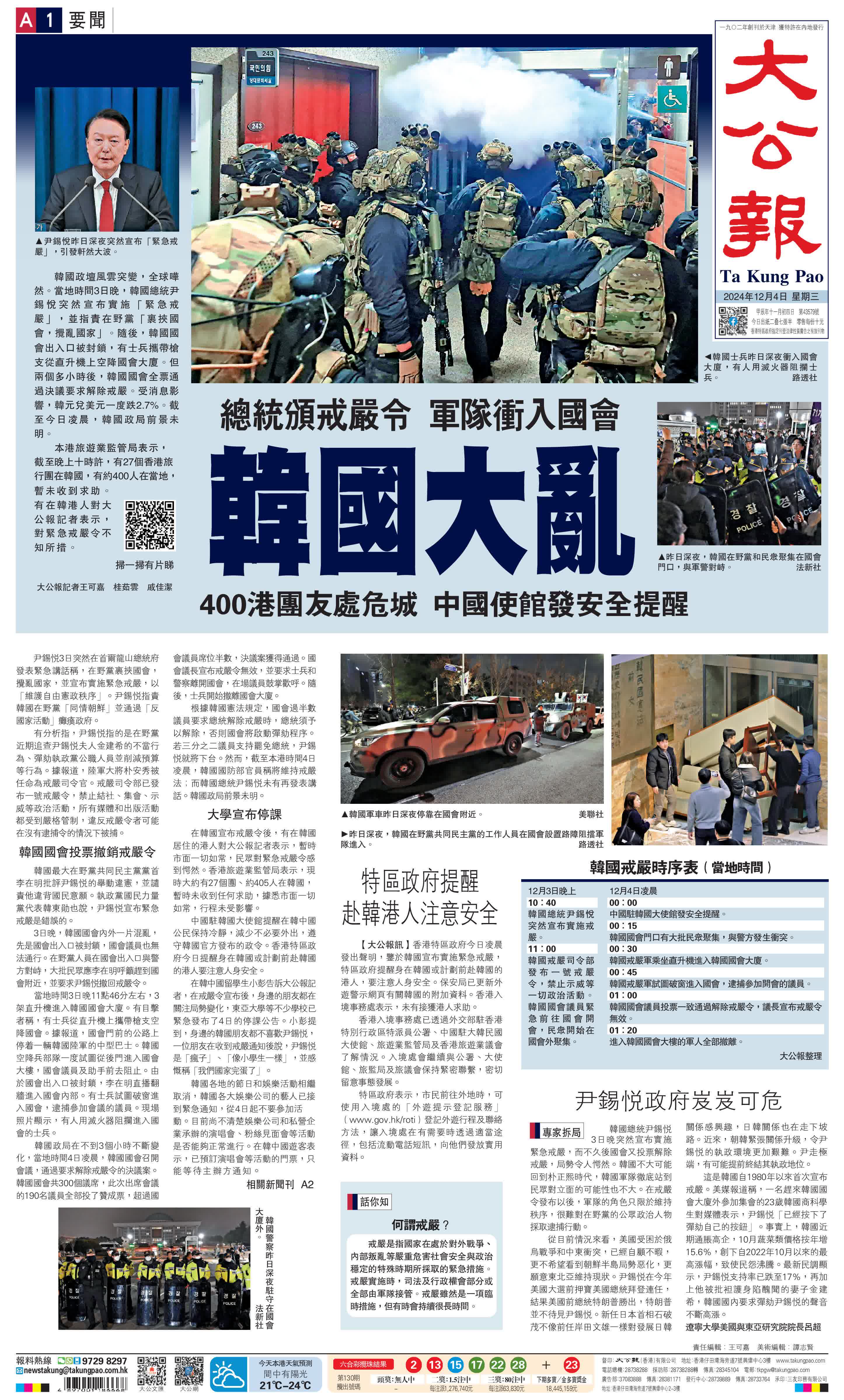 本港旅遊業監管局表示,截至晚上十時許,有27個香港旅行團在韓國,有約400人在當地,暫未收到求助。有在韓港人對大公報記者表示,對緊急戒嚴令不知所措。
