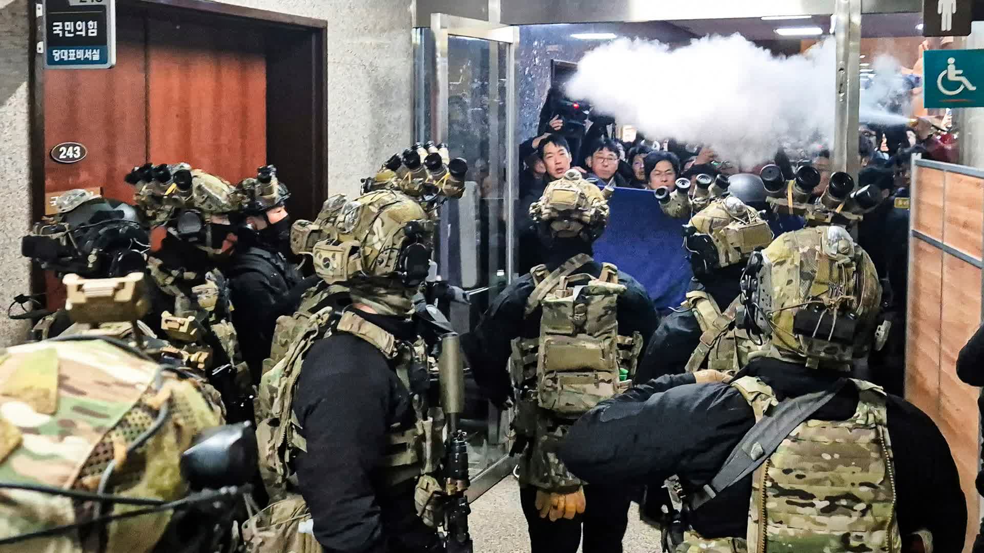尹錫悅宣布「緊急戒嚴」後,韓國最大在野黨共同民主黨黨首李在明呼籲韓國民眾前往國會,保護國會。韓國國會出入口關閉,國會議員也不可通行。試圖進入國會的人群同警察對峙。