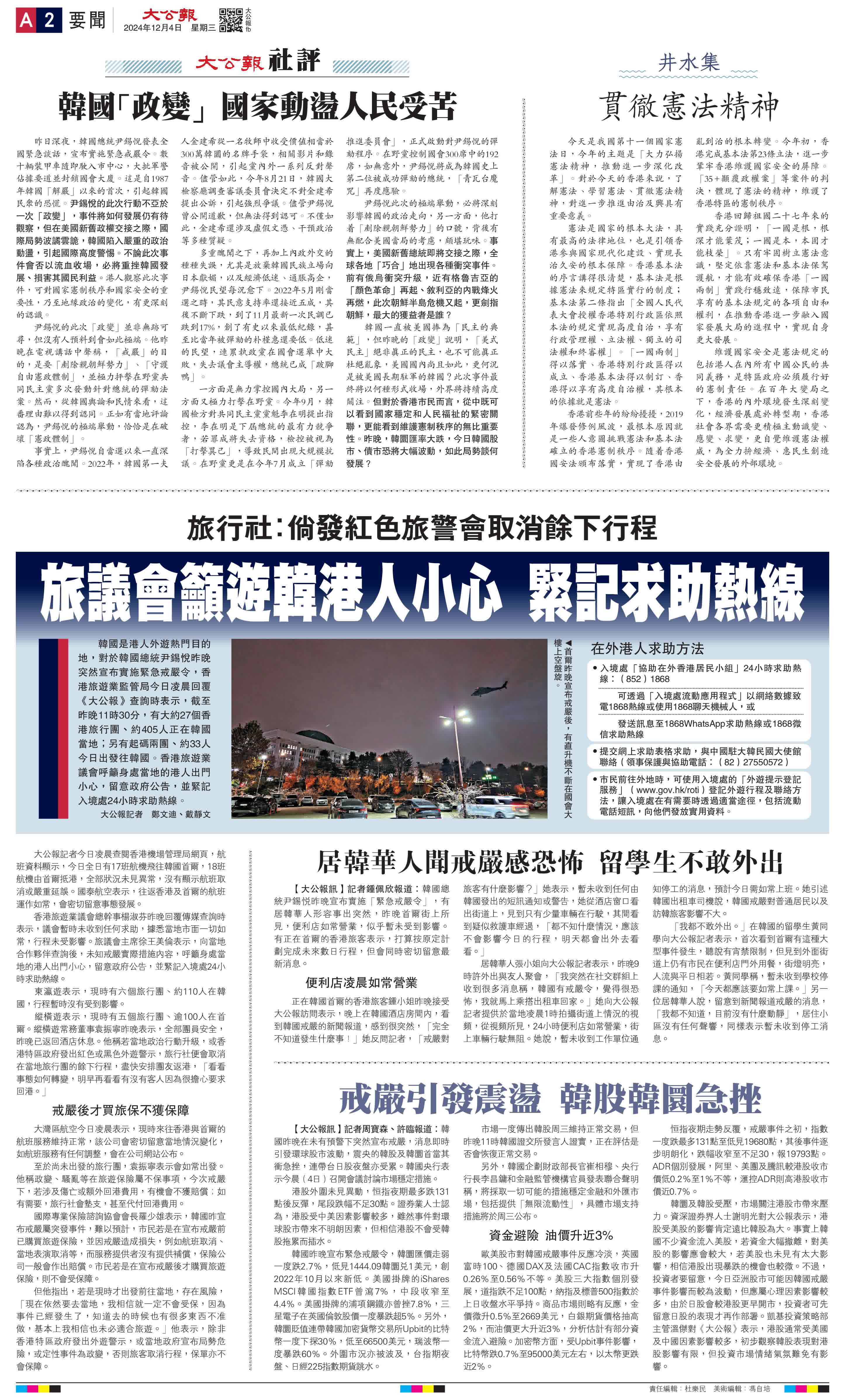 (大公報記者 鄭文迪、戴靜文)韓國是港人外遊熱門目的地,對於韓國總統尹錫悅昨晚突然宣布實施緊急戒嚴令,香港旅遊業監管局今日凌晨回覆《大公報》查詢時表示,截至昨晚11時30分,有大約27個香港旅行團、約405人正在韓國當地;另有起碼兩團、約33人今日出發往韓國。香港旅遊業議會呼籲身處當地的港人出門小心,留意政府公告,並緊記入境處24小時求助熱線。