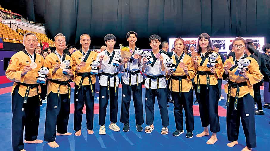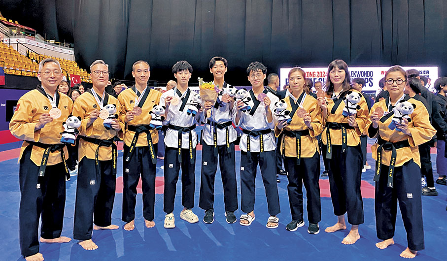 (香港文匯報記者 葉詩敏)香港2024世界跆拳道品勢錦標賽,昨日(3日)假香港體育館(紅館)上演第4天賽事。港隊繼17歲小將劉子琦於首日贏得女子青年組公認品勢銅牌後,昨日再添3面團體賽銅牌。當中世界排名第11位的陳頌賢,夥拍呂靖楠和劉浩賢在U30男子團體奪銅,寫下港隊跆拳道品勢歷史。三人笑言是隨韓籍教練近3年「艱苦」、「非人類」訓練成果,陳頌賢感觸說:「但捱過了就有現在好成績,踏上世界舞台。」