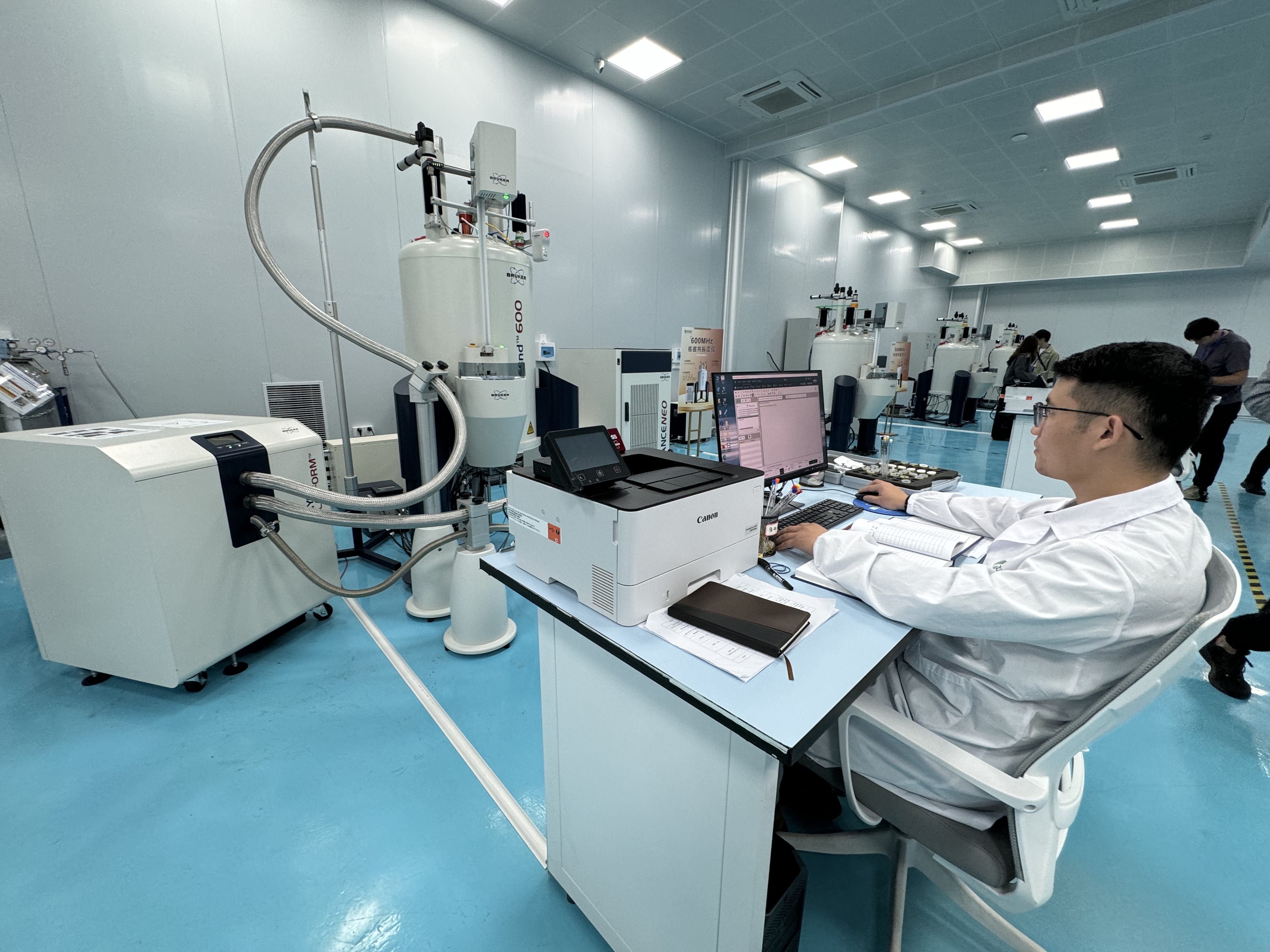 走進中科中山藥物創新研究院,一座座以玻璃幕牆裝潢的實驗樓和人才公寓氣派十足。當記者走入研究院地下一樓的核磁技術中心,則看到有6台核磁共振波譜儀正在運作,其中一台還是廣東省首台800 MHz高場核磁譜儀,幾名研究員正在操作譜儀設備。