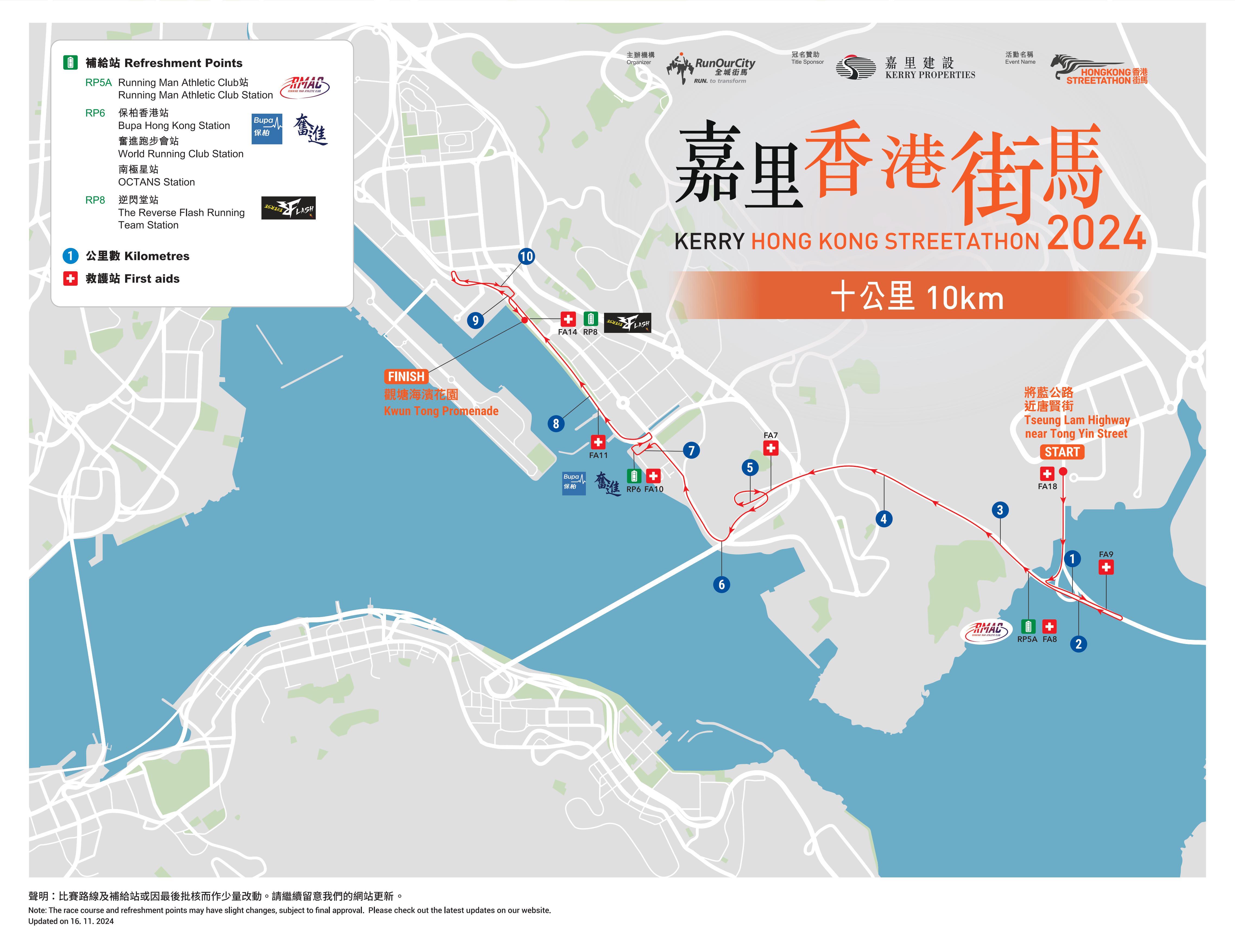 10公里賽事由將軍澳將藍公路起步,跑上將軍澳跨灣大橋進入將藍隧道,經茶果嶺及觀塘繞道,以觀塘海濱花園作終點。