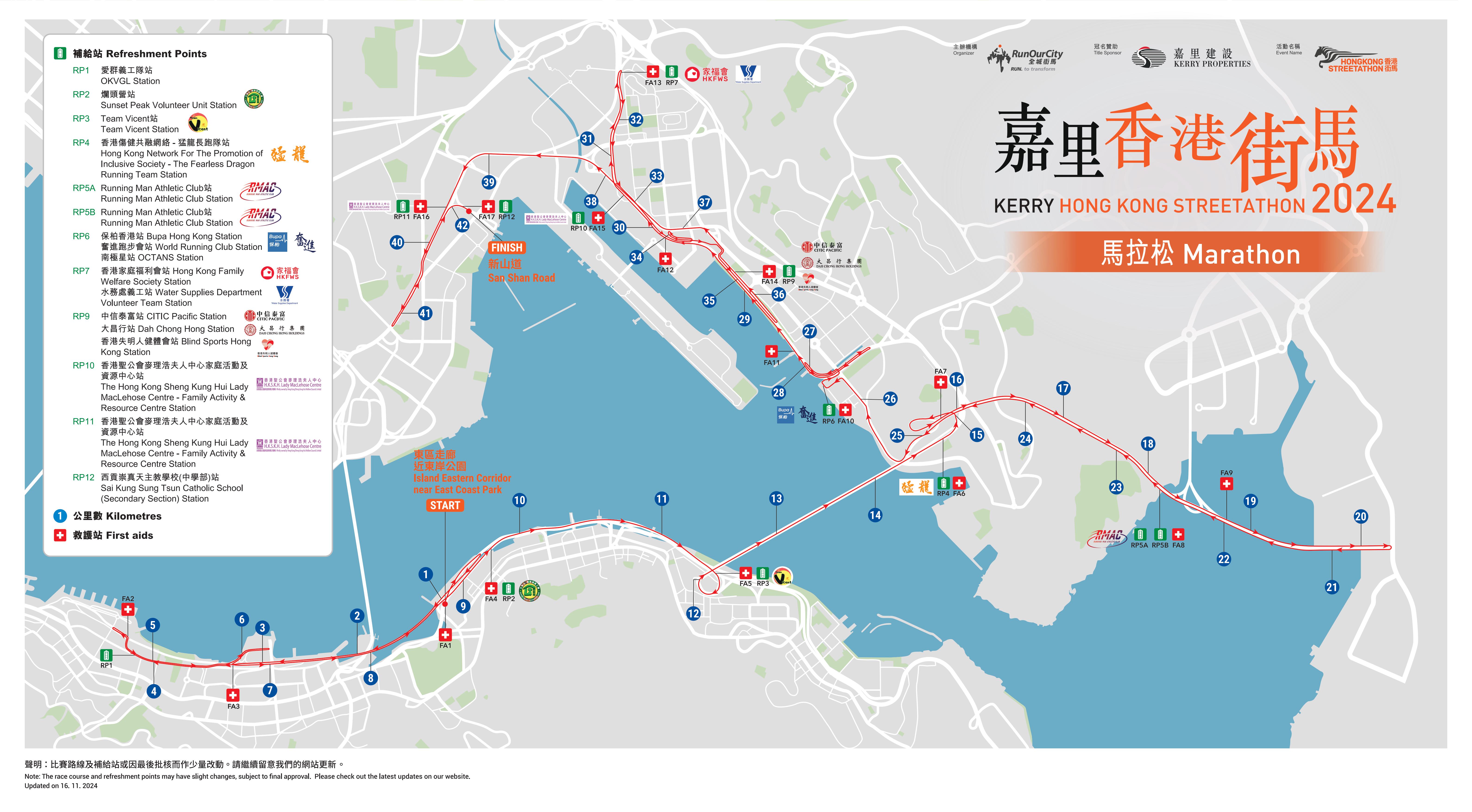 「香港街馬」全馬路線圖及補給站和救護站: