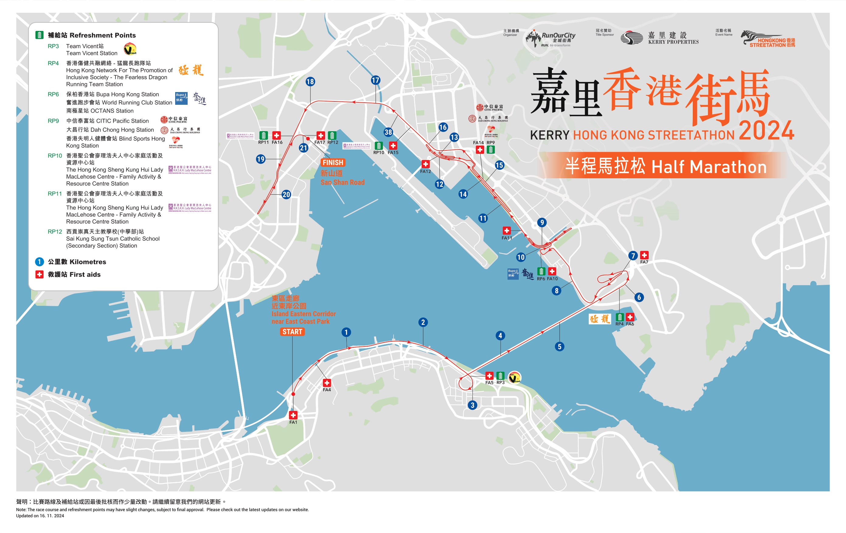 「香港街馬」半馬路線圖及補給站和救護站:
