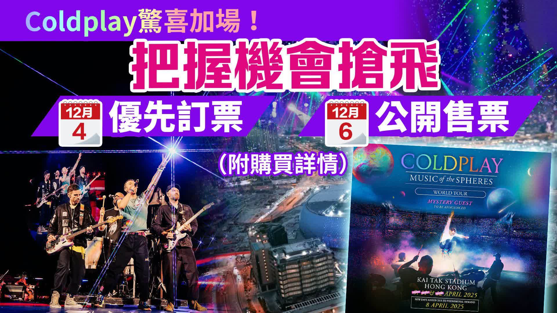 (大公文匯全媒體 記者 九皋)Coldplay演唱會《Coldplay: Music Of The Spheres World Tour》反應熱烈,明年4月9、11及12日三場門票秒速售罄,但仍然有大批粉絲沒能搶到飛。主辦單位Live Nation宣布加開4月8日一場,並於12月6日公開發售,今日(4日)更有藝人官網優先訂票,早前登記過優先訂票的粉絲將會收到附有訂票Cityline網頁的電郵,萬勿錯過!