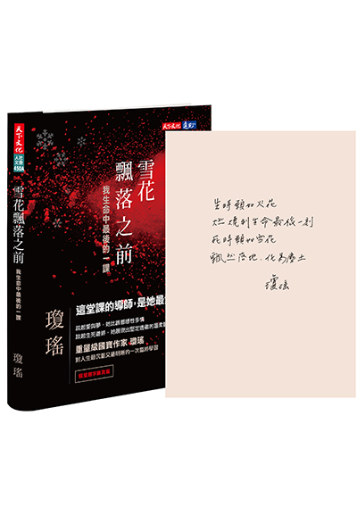 瓊瑤遺作《當雪花飄落》,相信與她於2017年出版的作品《雪花飄落之前》一脈相承,這本書是以瓊瑤的親身經歷寫就,並且稱之為「生命中最重要的一本書」。不同於瓊瑤以往的寫作格局,《雪花飄落之前》深入探討「老、病、死」的問題,呼籲社會重視老人的「善終權」。瓊瑤在書中表明如何面對「老年」、「失智」、「插管」、「死亡」的態度,更表示「愛到極致,是把痛苦留給自己,對摯愛的人放手!不是用醫療加工的方式,讓摯愛的人求生不得,求死不能!」