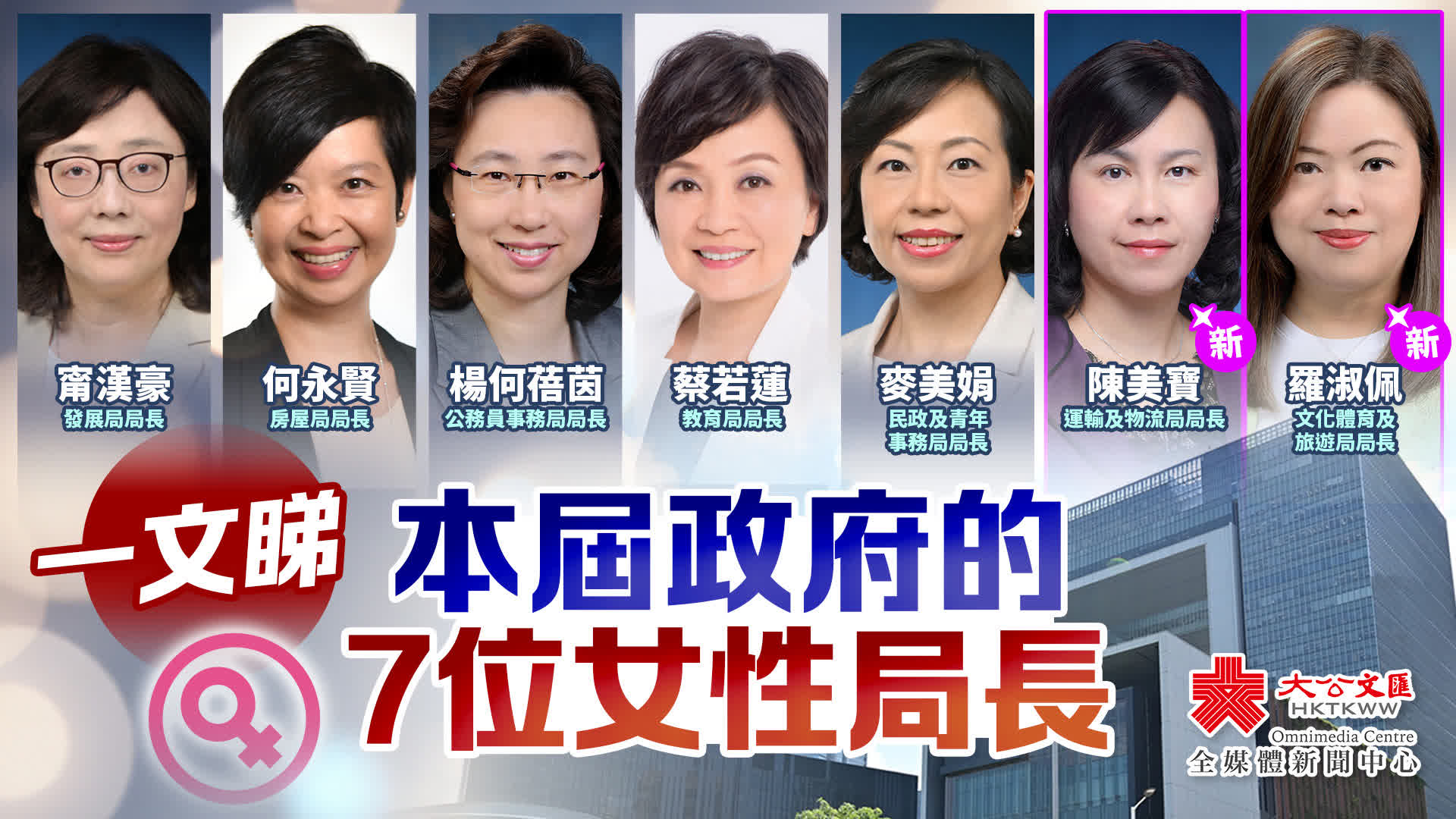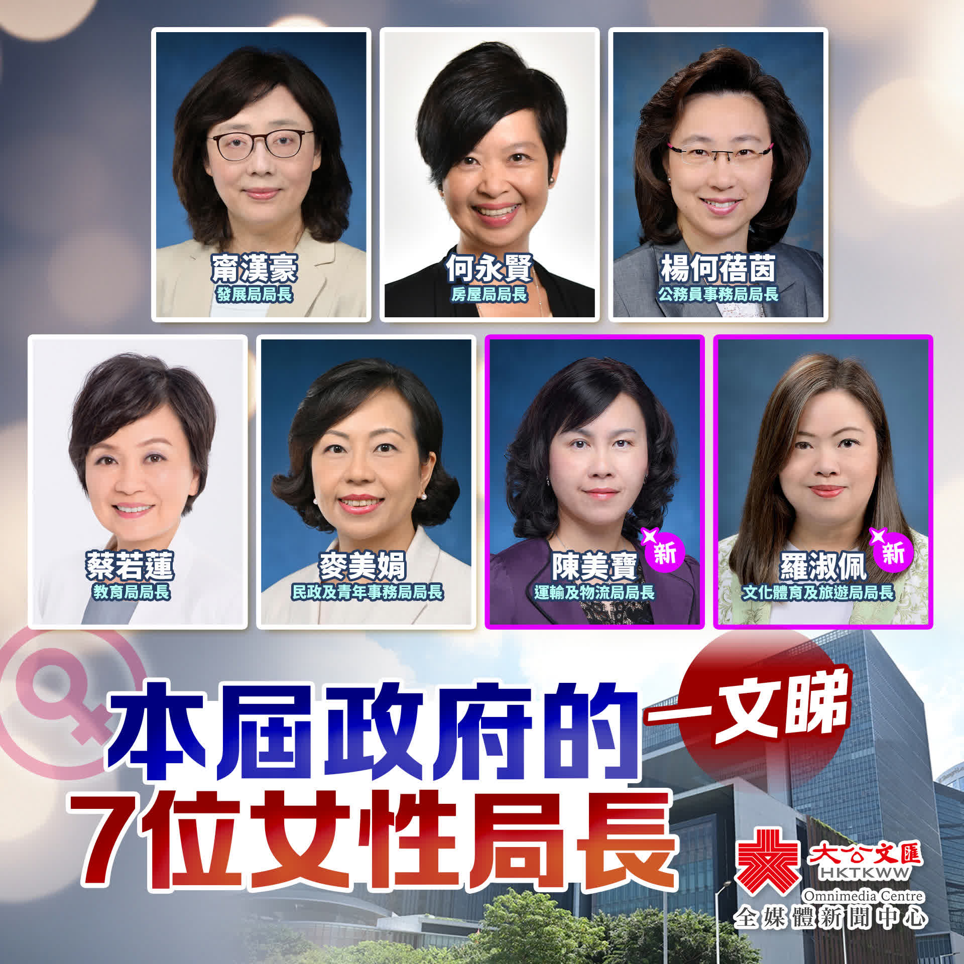 至此,新一屆特區政府三司十五局現有7位女性局長,分別是:發展局局長甯漢豪、房屋局局長何永賢、公務員事務局局長楊何蓓茵、教育局局長蔡若蓮、民政及青年事務局局長麥美娟,以及今次履新的運輸及物流局局長陳美寶、文化體育及旅遊局局長羅淑佩。