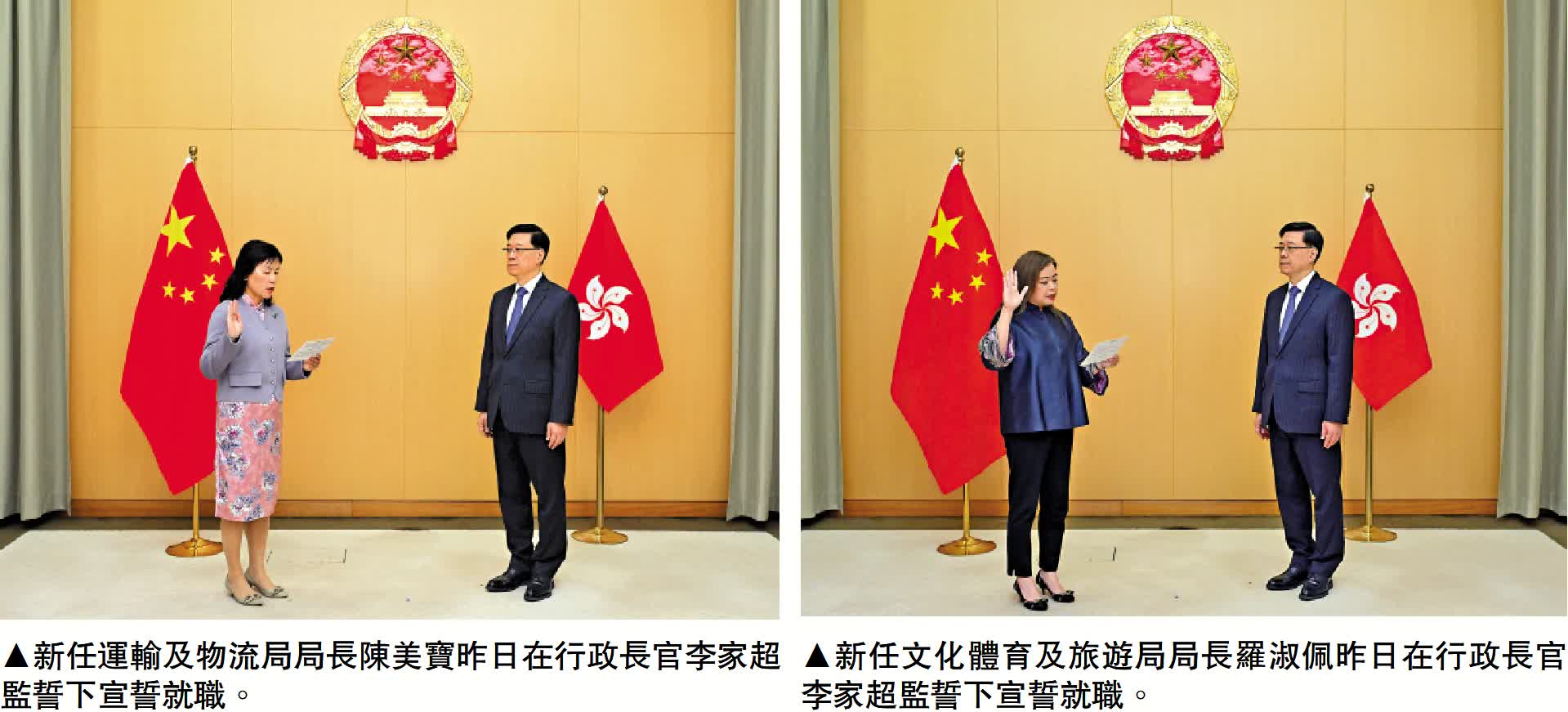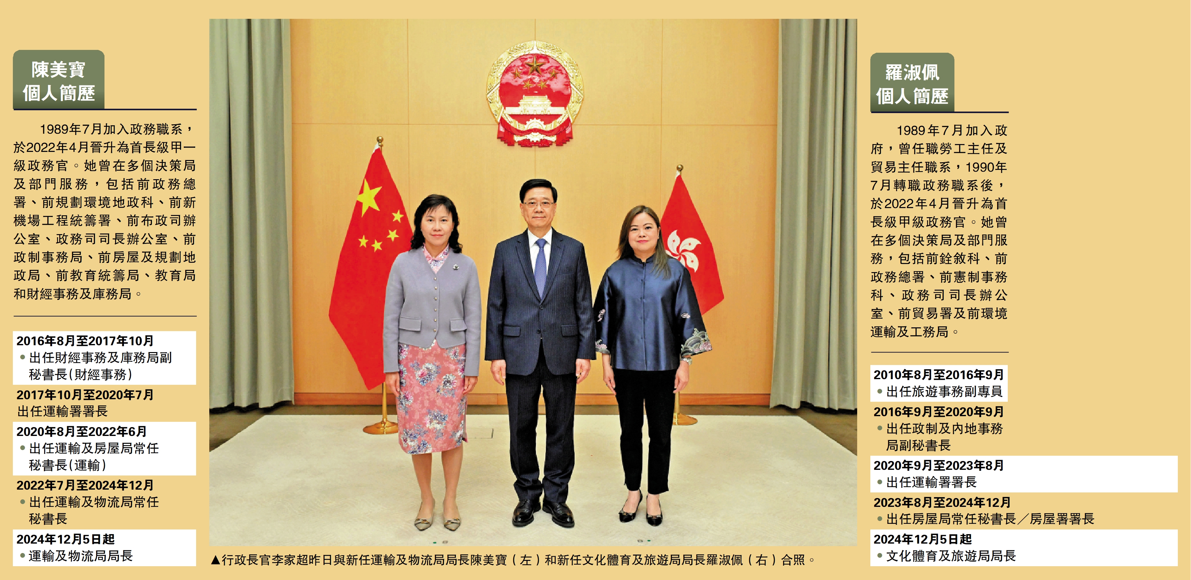 (大公報記者 義昊)行政長官李家超昨日公布,依照基本法相關規定,中央人民政府根據行政長官的提名和建議,任命陳美寶為運輸及物流局局長、羅淑佩為文化體育及旅遊局局長,同時免去楊潤雄的文化體育及旅遊局局長職務、林世雄的運輸及物流局局長職務。李家超表示,陳、羅二人都是資深政務主任,在政府服務超過35年,表現卓越,具備豐富行政和管理經驗、領導能力、解說能力和主動性。有信心她們會不屈不撓、全力以赴帶領相關決策局,服務市民,貢獻香港社會。