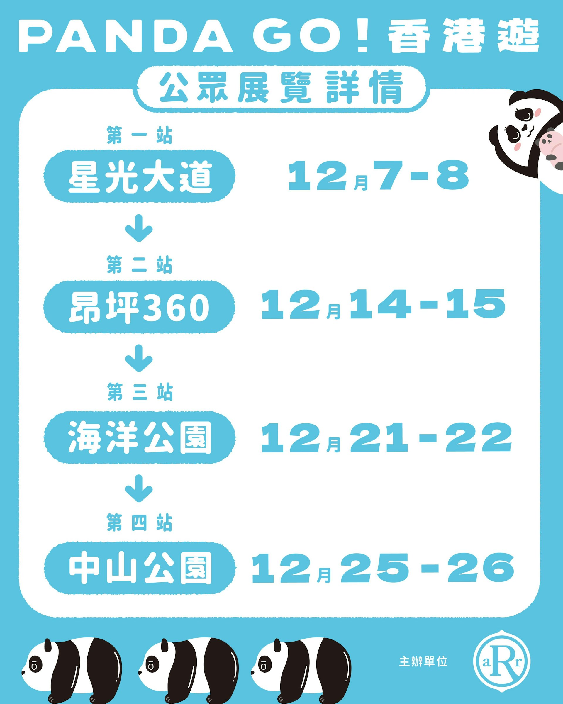 全港最大型熊貓主題展覽《PANDA GO!香港遊》(PANDA GO)12月2日到港。PANDA GO以8款全新設計的大熊貓造型,組合出2500隻大熊貓雕塑,自12月7日起以別具創意形式於香港「四圍走」,到訪多個香港特色地標,包括有4場公眾展覽。