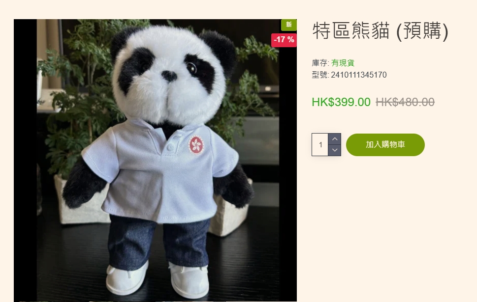 穿着「香港 Hong Kong」字樣T恤的新品特區熊貓公仔也已經開始預售。