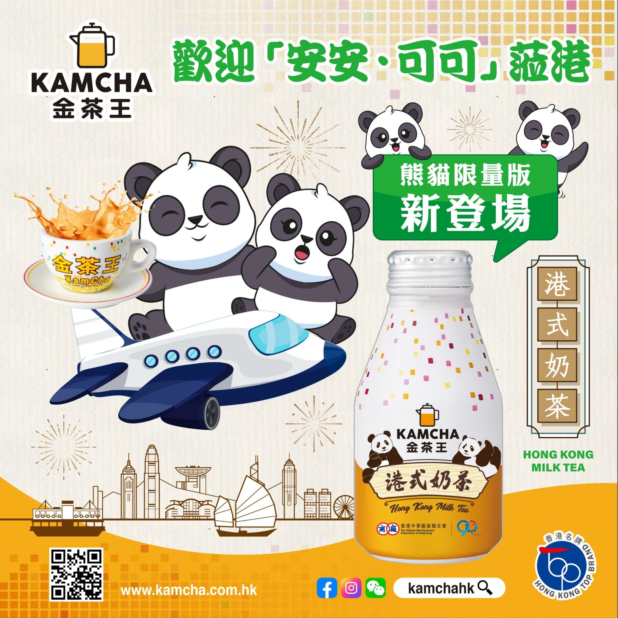 為慶祝中央贈予香港的大熊貓「安安」「可可」抵港,恰逢中華廠商聯合會成立90周年及金茶王成立15周年,金茶王推出限量版設計「熊貓奶茶」。「熊貓奶茶」以國寶大熊貓IP為設計靈感,用可愛的大熊貓包裝帶來港式奶茶風味,購買1箱(24樽)亦有大熊貓毛公仔贈送!