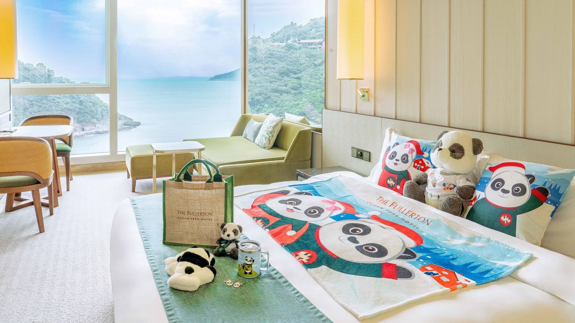 如果只買大熊貓紀念品不夠過癮,還可以入住熊貓主題酒店,沉浸式體驗被大熊貓環繞的快樂。海洋公園富麗敦酒店的大熊貓主題房間,為遊客打造夢幻的難忘假期。進入房間就會與富麗敦海洋公園酒店吉祥物——富富與麗麗熊貓一同踏上滿載驚喜的節日冒險旅程,沉浸在溫馨氛圍中。
