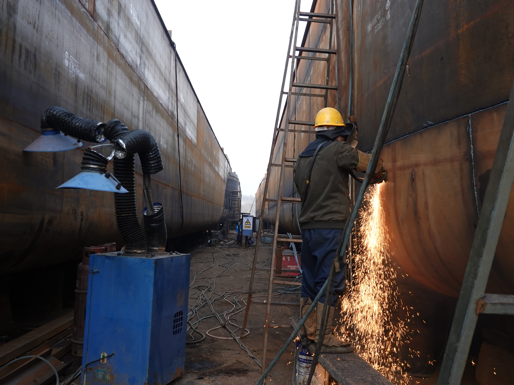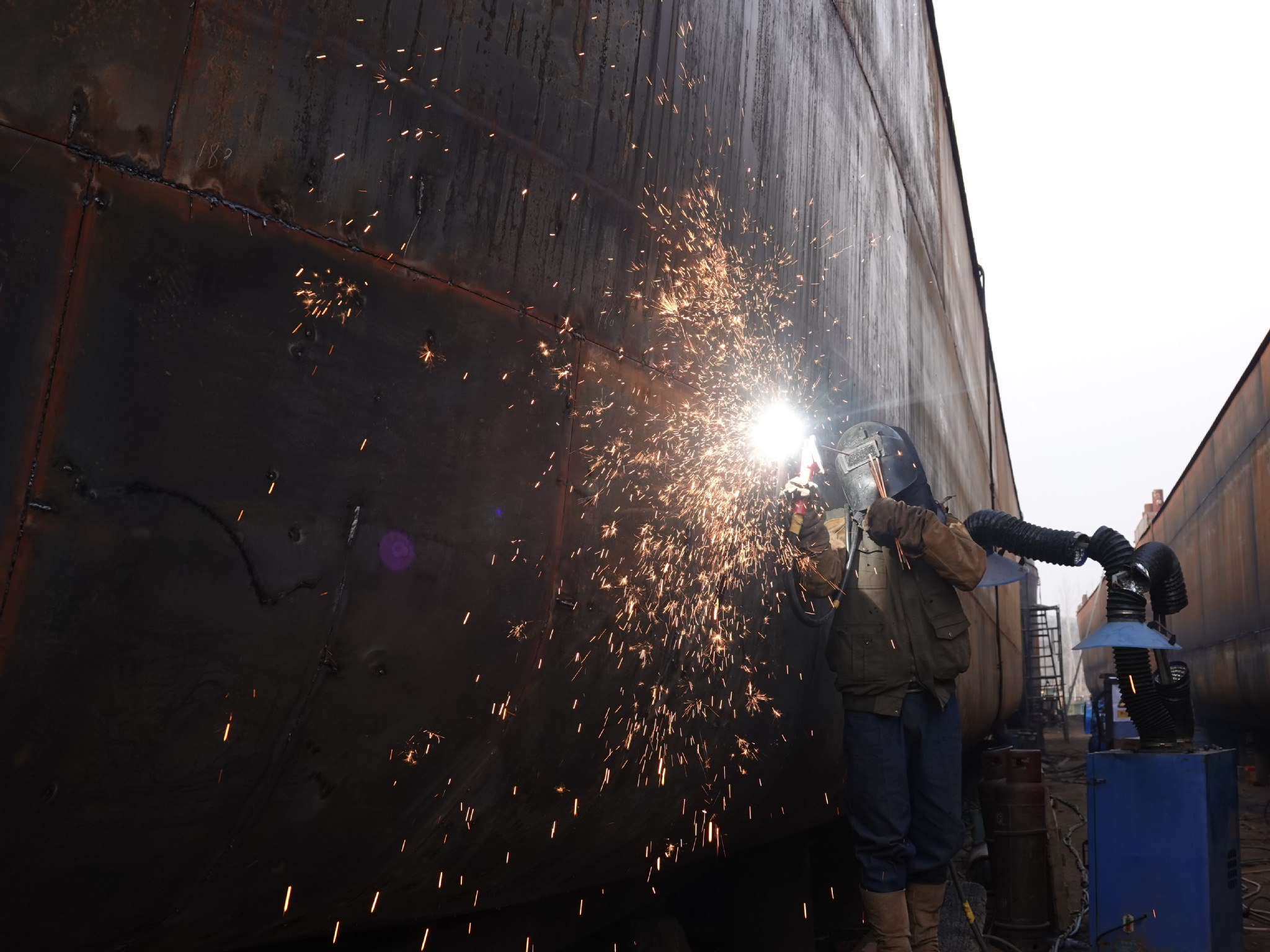 記者走進有沈丘縣人大代表李飛創辦的周口北航船舶修造有限公司採訪。該公司坐落在周營鎮劉集村沙潁河畔。記者在偌大的露天造船生產車間看到,這裏弧光閃爍、焊花飛濺、機器轟鳴,多艘正在拚裝焊接、安裝的大型貨運船舶有序擺放在泊位上,極為壯觀。