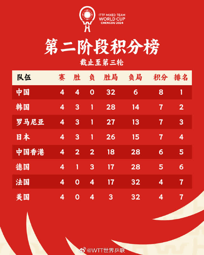 目前,中國隊排在積分榜首位。明天中午12點國家隊對陣法國隊,明晚19點則對陣羅馬尼亞隊。國乒力爭延續連勝的腳步,以排名第一的成績晉級第三階段。