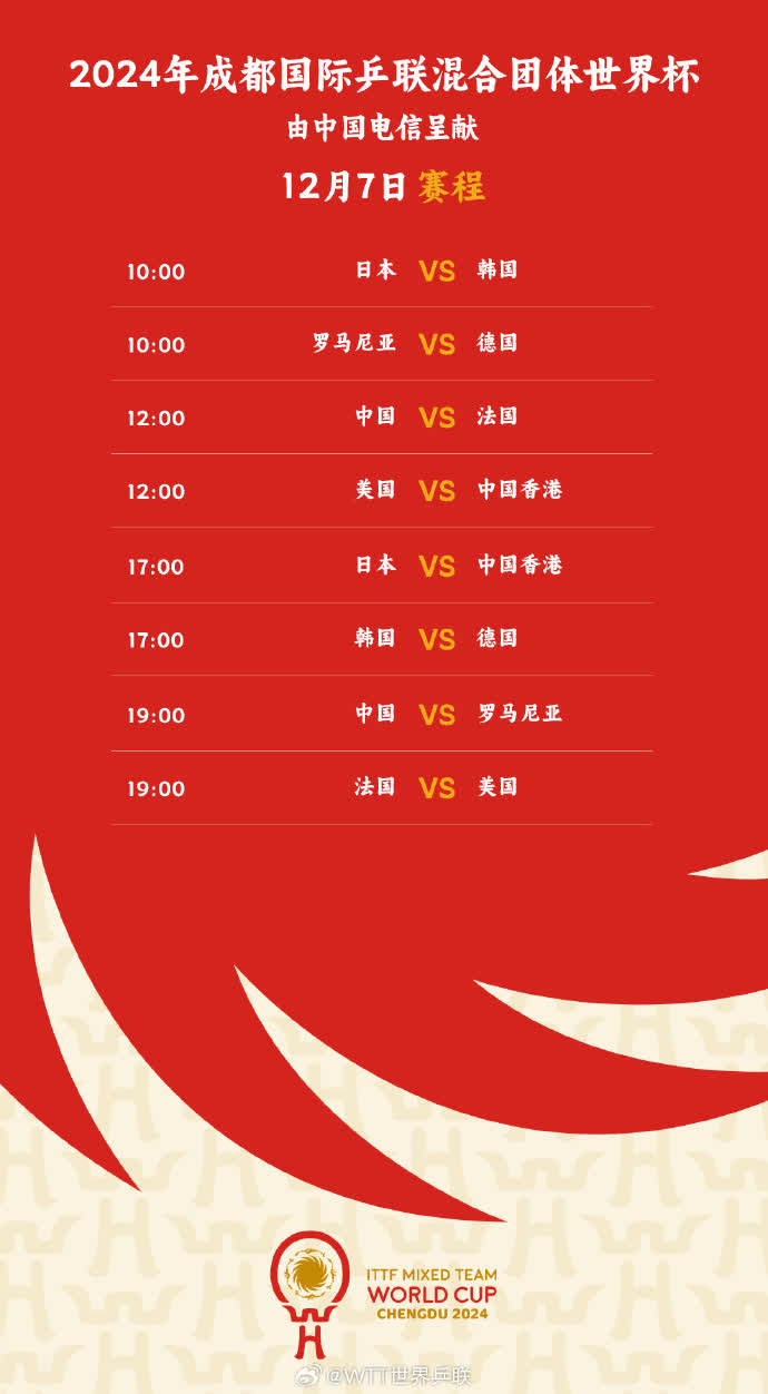 (大公文匯網記者 王凱輝 綜合整理報道)2024年成都混合團體世界盃今日(6日)賽程公布,國家隊今晚7時將對戰日本隊。為國家隊王楚欽、林詩棟、梁靖崑、林高遠、孫穎莎、王曼昱、王藝迪、蒯曼加油!