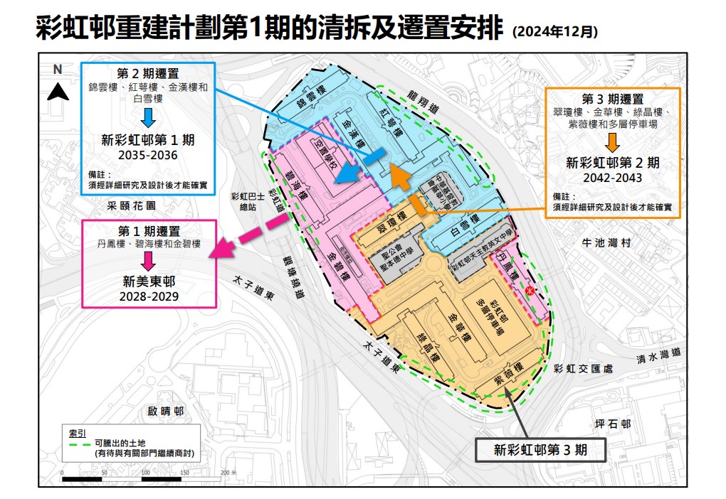 至於彩虹邨重建計劃,房委會宣布清拆彩虹邨第1期包括碧海樓、金碧樓和丹鳳樓三座樓宇的清拆及遷置安排。受影響租戶由今日起至2029年4月的目標清空日期,約有52個月的通知期以遷出單位。