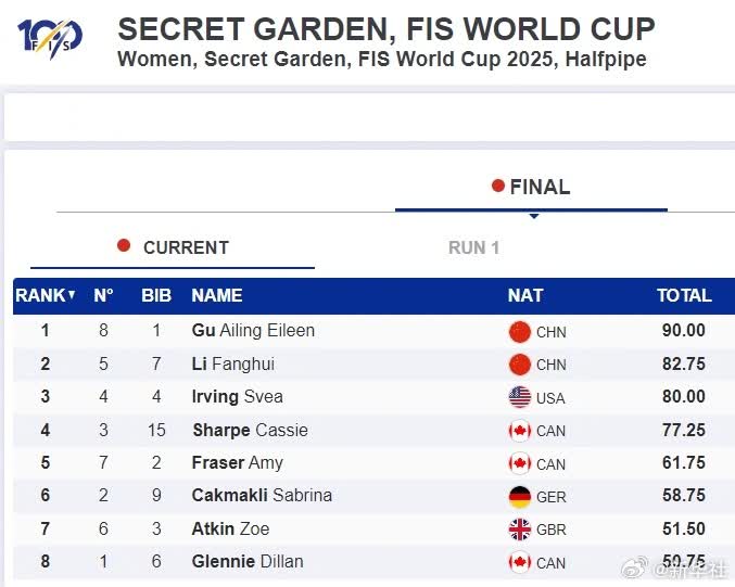 崇禮站是本賽季世界盃的第二站比賽,今年9月的新西蘭卡德羅納站比賽中,谷愛凌和張可欣包攬了女子U型場地技巧的冠亞軍,本次也是中國選手連續第二站完成對該項目金銀牌的包攬。