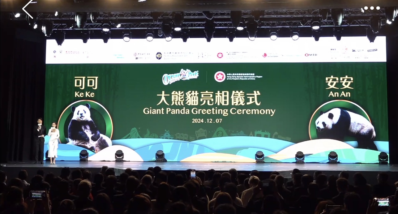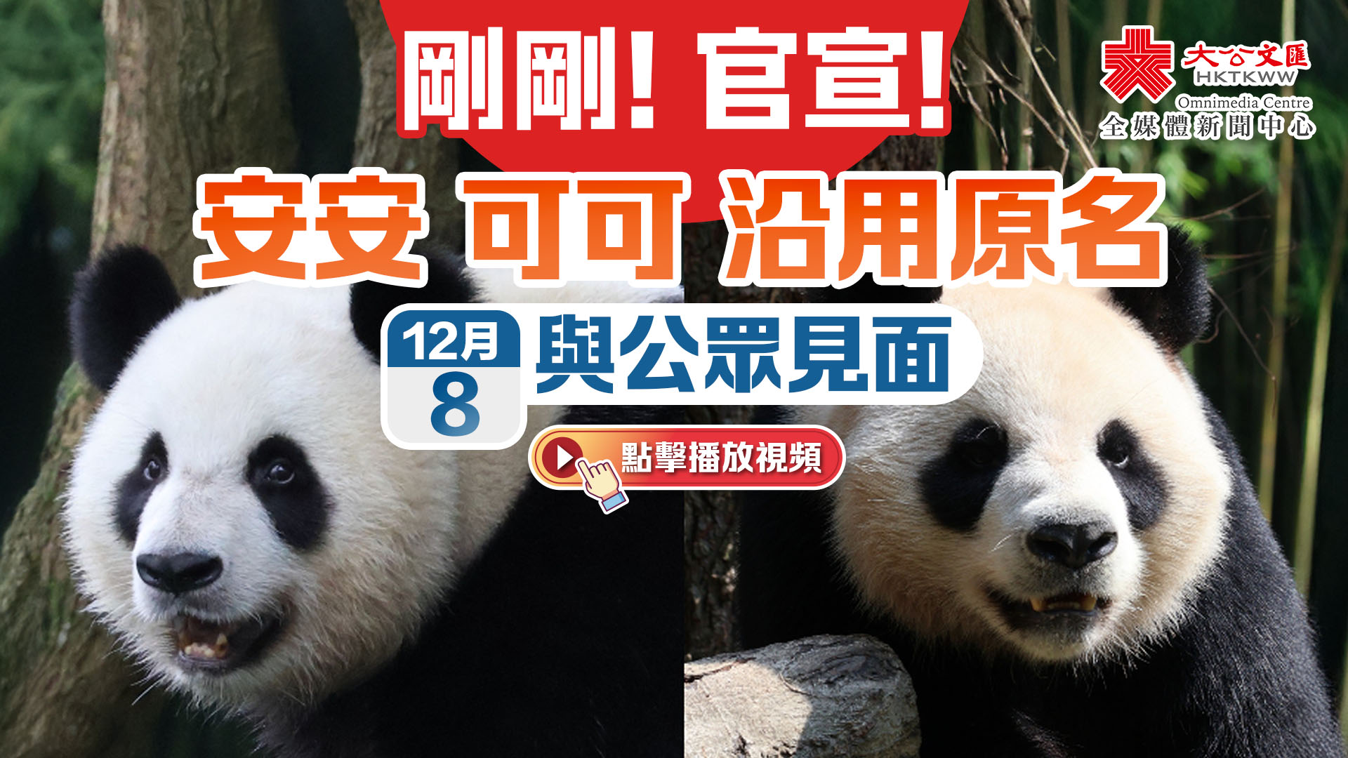 大公文匯全媒體報道,海洋公園今日(7日)舉行「大熊貓亮相儀式」,揭曉中央贈港大熊貓的新名字。兩隻大熊貓來港前名字為「安安」(雄性大熊貓)及「可可」(雌性大熊貓),評審團今日宣布,牠們依然採用原名,並將於明日(12月8日)與公眾見面。