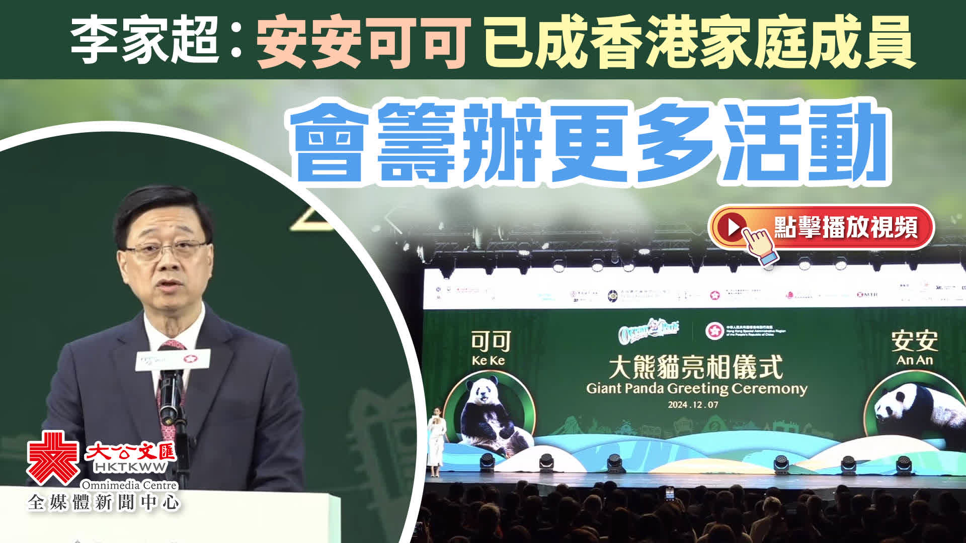 李家超稱,安安可可已成為香港的家庭成員,相信大家已迫不及待與牠們見面,歡迎市民來海洋公園見面交流。他提到,特區政府會把握、推動、發揮大熊貓帶來的機遇,連同各界積極籌辦更多相關活動,推出具有本地特色的大熊貓產品,為旅客帶來特別體驗,推動各個行業。