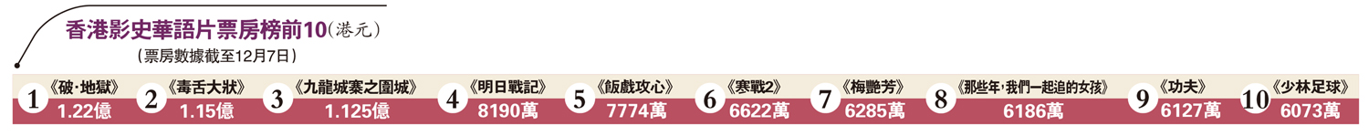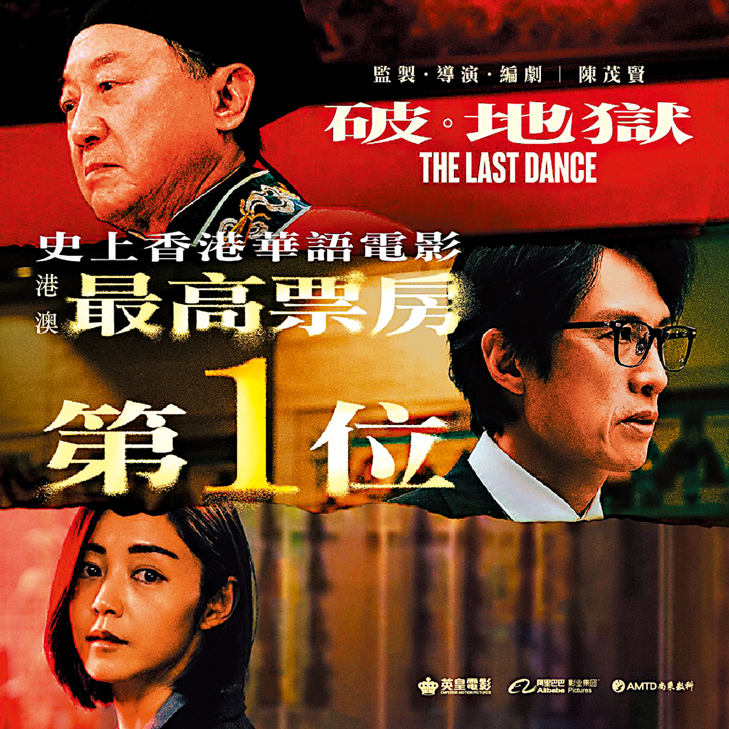 (大公報記者 溫穎芝)由黃子華、許冠文、衛詩雅、朱栢康等主演的電影《破·地獄》,自11月9日開畫,上映29日的港澳票房已衝破1.22億,超越1.15億票房的《毒舌大狀》,正式成為香港影史上華語片最高票房第1位。電影公司昨日(7日)在電影官方社交平台發文感謝所有觀眾支持,以及台前幕後每一位的付出,成就《破·地獄》破紀錄。