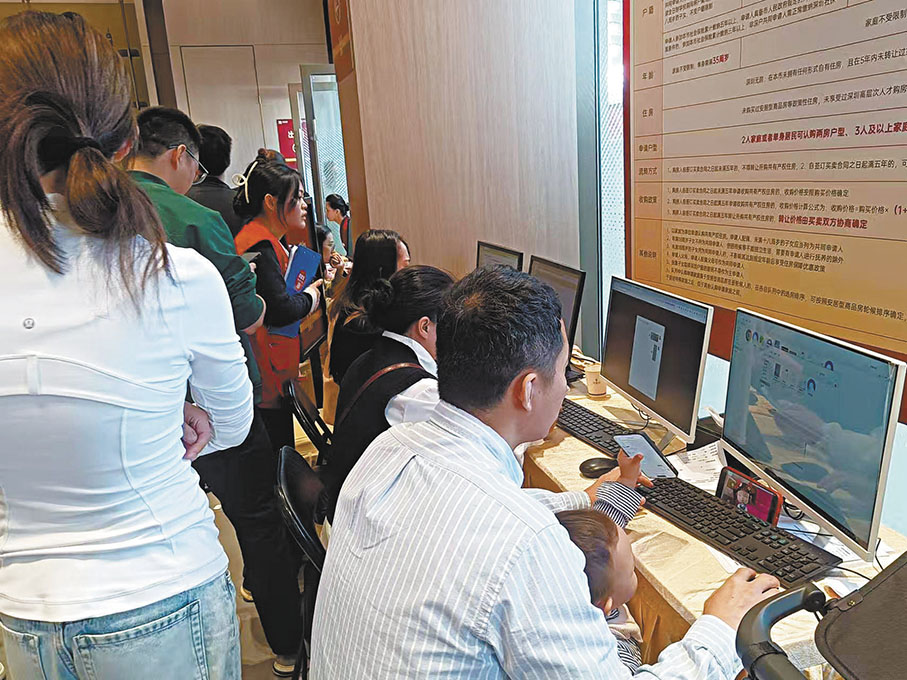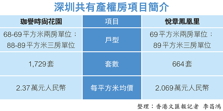 (香港文匯報記者 李昌鴻)備受關注的深圳共有產權房,首兩批近2,400套單位日前正式面向公眾認購,在深圳繳交社保的港人可與深戶家人作為共同申請人參與,實現低成本在深圳安居。記者前赴兩個共有產權項目之一的寶安區沙井「珈譽時尚花園」(珈譽府),儘管是工作日,惟仍擠滿大批市民前來看房、諮詢和提交申請。由於產權只有一半,房價低至僅2.1萬元(人民幣,下同)/平方米,68平方米兩房單位首期為15%,即21萬元便可實現安居夢。另一個同處寶安區項目「悅章鳳凰里」,均價更低至2.069萬元/平方米,兩房單位首期僅需19.2萬元起。不少市民熱切期盼早圓安居夢,兩個項目僅推出數日皆已獲超額認購申請。