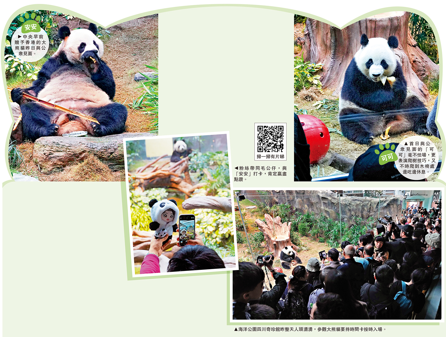 「安安」、「可可」昨日首度在海洋公園四川奇珍館與公眾見面。大公報記者上午約9時到現場,已見陸續有人到場排隊,半小時後,海洋公園的正門已出現一條人龍;據了解,有粉絲更提前兩小時出發,為搶先觀賞大熊貓。有粉絲帶着多隻大熊貓公仔入場,亦有人佩戴大熊貓頭飾、耳環等飾品。昨日上午10時,海洋公園一開園便湧入逾百名遊人,包括市民及內地、海外遊客,不少人直奔四川奇珍館,爭取排頭位。