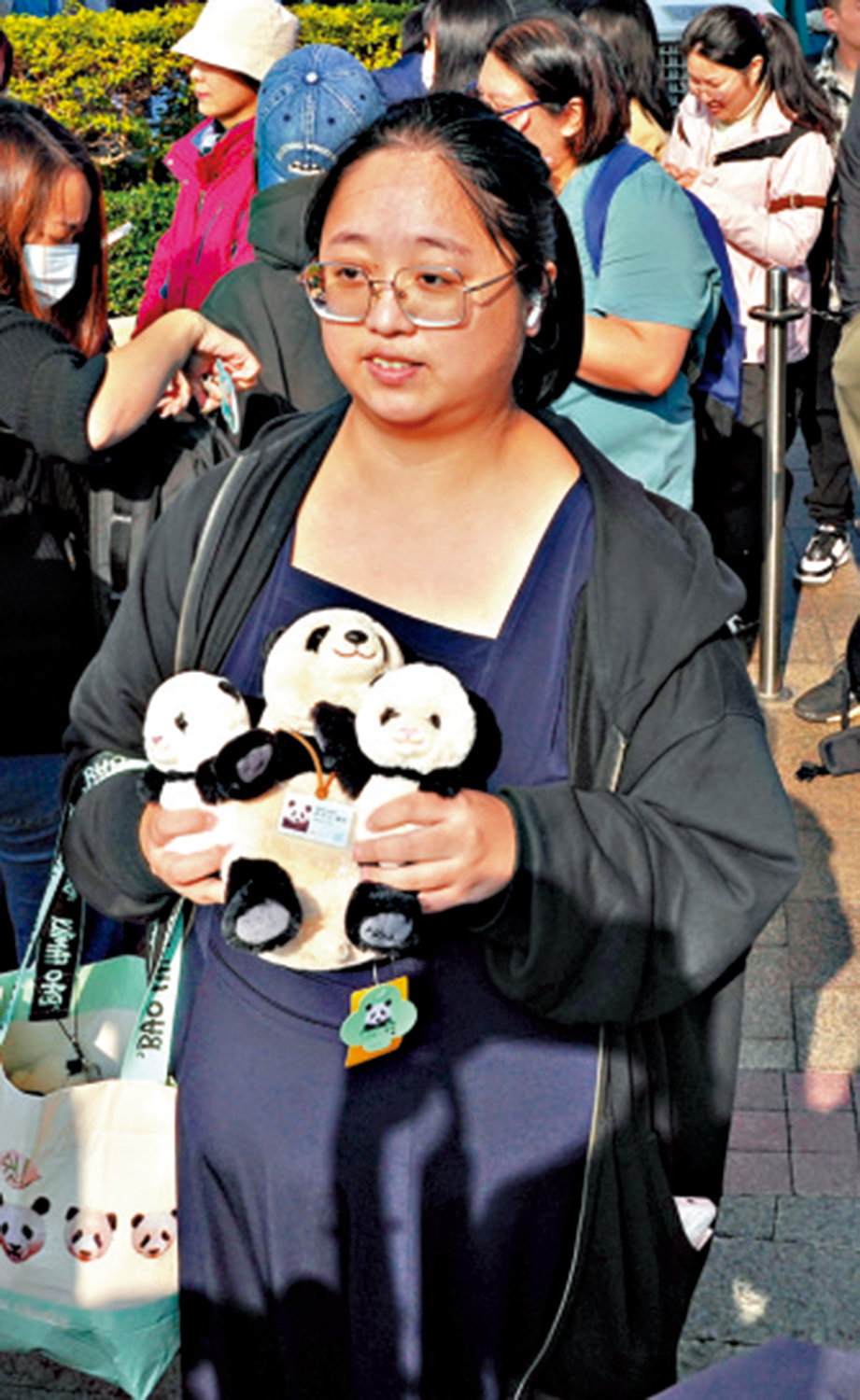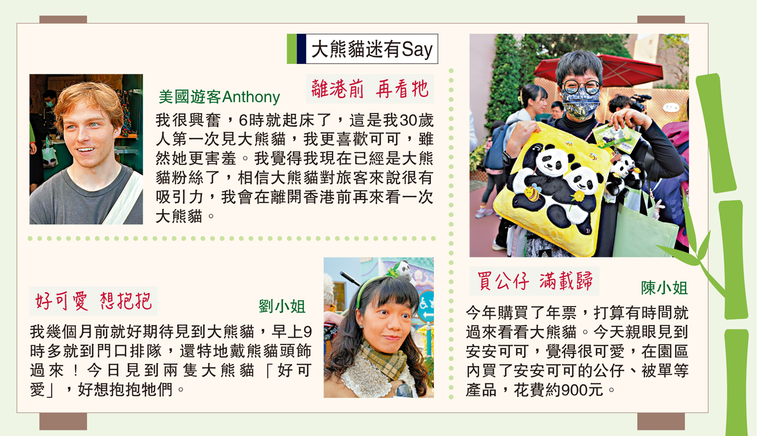 市民王小姐表示,數月前已十分關注大熊貓「安安」「可可」的動向,昨早特提前數小時到場搶「排頭位」。她透露買了「安安」和「可可」的毛絨公仔,花費近400元,未來將繼續來海洋公園探望熊貓,預計會再消費相關產品和食物。
