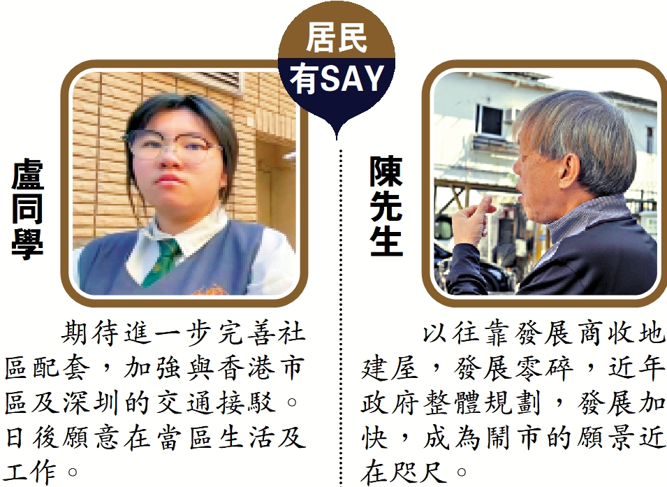 在洪水橋居住並就讀區內中學的盧同學一直有留意洪水橋/厦村新發展區的規劃及發展,她認為,現時區內的食肆、商舖、文體設施等生活配套不足,期待新發展可以進一步完善社區配套,同時可以加強新界北部與香港市區乃至與深圳的交通接駁。她相信,隨交通等基建發展後,新界北部地區與市區差別不大,而且更接近深圳,往來更方便,她會願意在當區生活及工作。