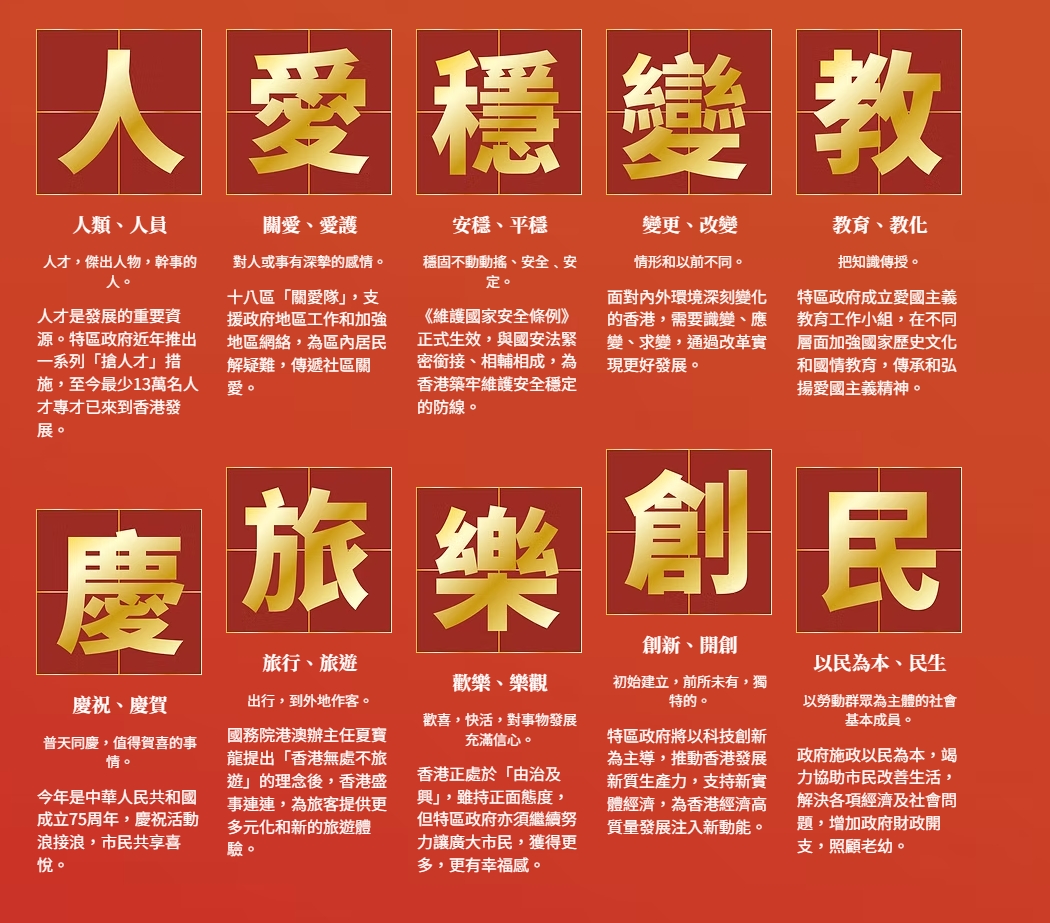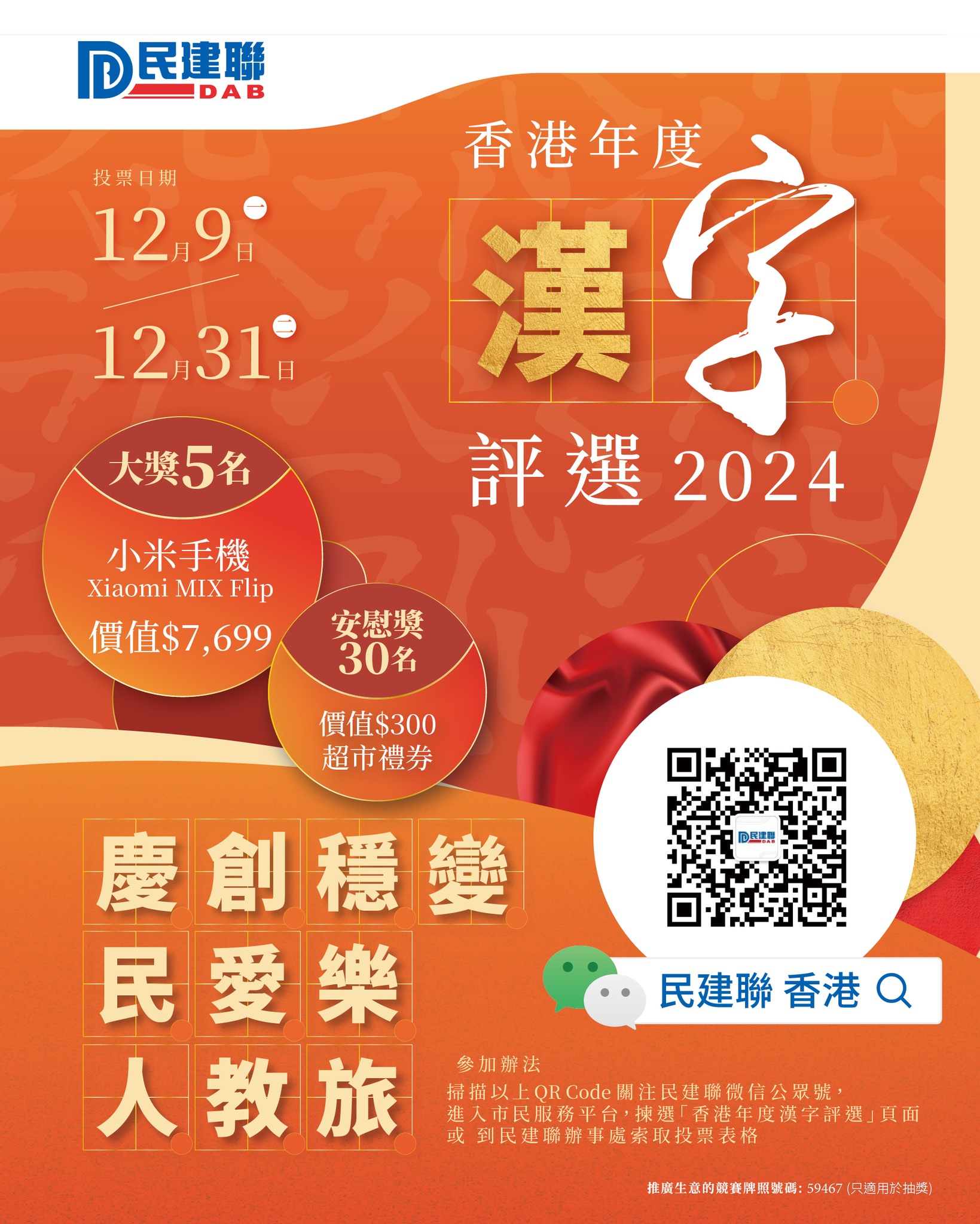 大公文匯全媒體報道,民建聯「香港年度漢字評選」今日(9日)起開始接受投票,投票者可在「人」、「愛」、「穩」、「變」、「教」、「慶」、「旅」、「樂」、「創」及「民」10個字中,選出一個代表2024年感受或社會狀況的漢字。