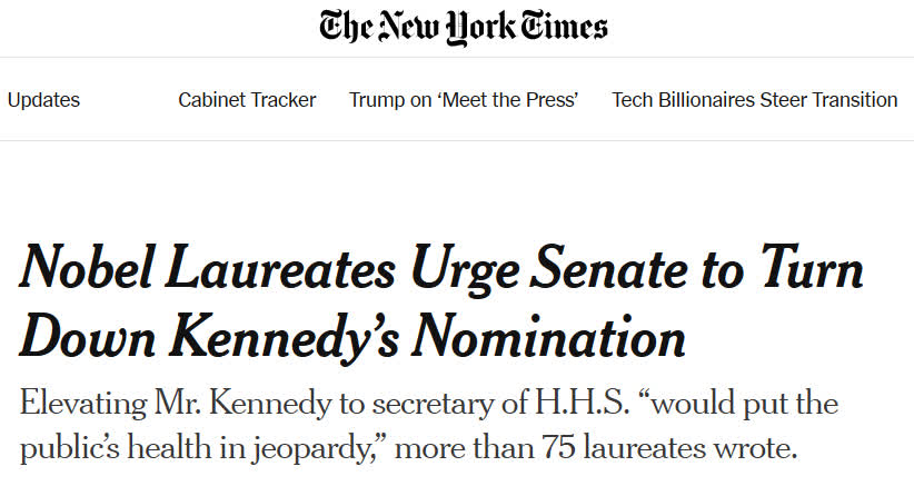 這些獲獎者質疑肯尼迪是否適合領導負責保護公眾健康和資助生物醫學研究的部門,稱肯尼迪在醫學、科學或管理方面「缺乏資歷」。「讓肯尼迪先生負責衞生與公眾服務部將會危及公眾健康,破壞美國在健康科學領域的全球領導地位。」信中警告說,如果肯尼迪的提名得到確認,他對疫苗和飲用水氟化等公認的公共衞生工具的反對,將對國家的福祉構成威脅。
