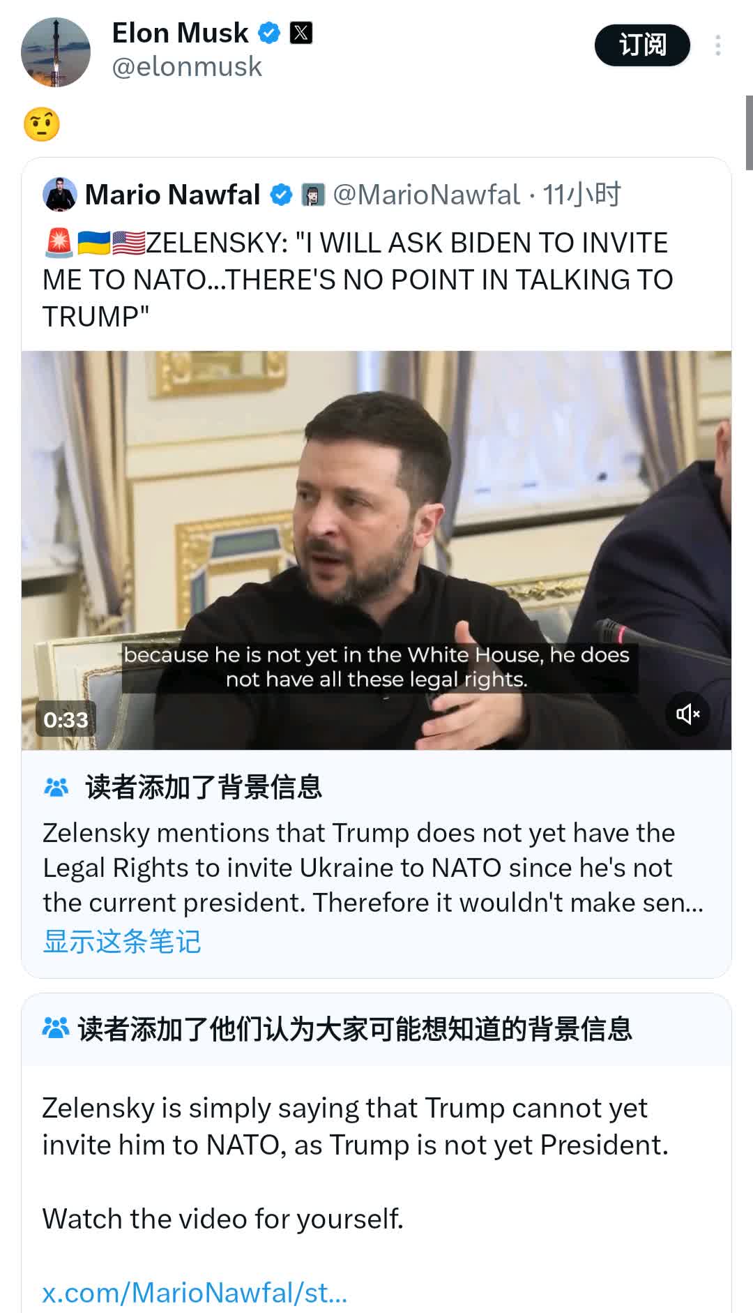 RT稱,這則引發馬斯克回覆的帖文寫道,「澤連斯基:我會請求(美國現任總統)拜登邀請我(烏克蘭)加入北約……與(美國當選總統)特朗普談話毫無意義。」帖文還配上了澤連斯基發表這番言論時的視頻。
