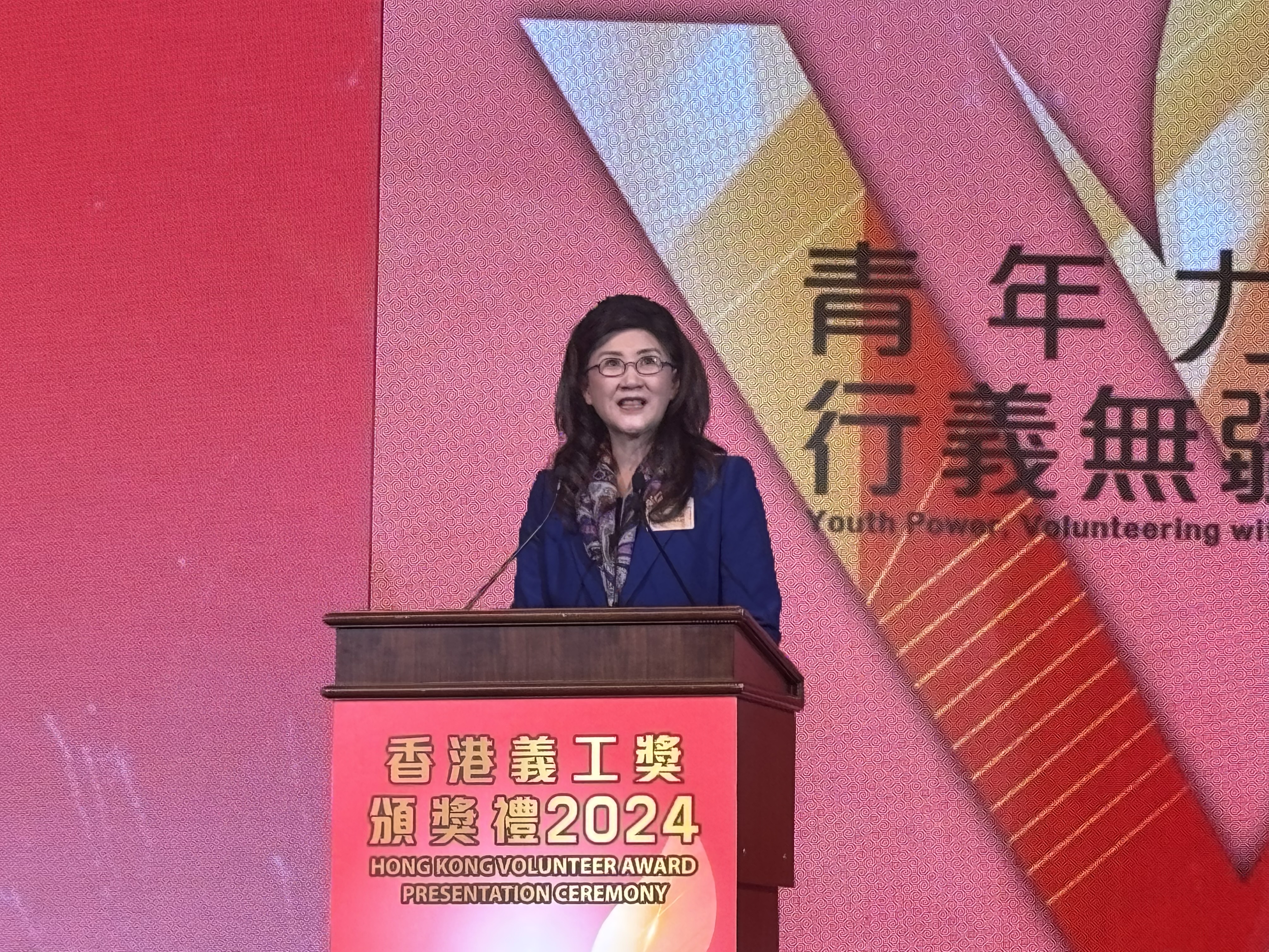 義務工作發展局主席彭韻僖致辭時表示,今年所頒發的獎項數目再創新高,反映出社會各界都積極響應「人人行義」精神,香港市民目標一致,以義務工作建構和諧共融的社會。更鼓勵青年人,多展現他們活力及創意,透過參與義務工作,為香港、祖國,以至全世界作出貢獻。